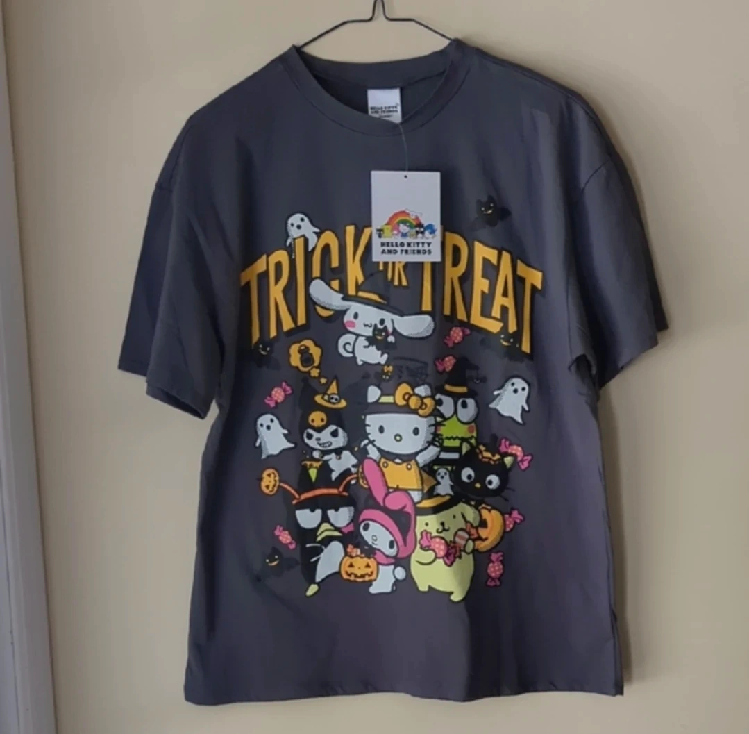 This grey t-shirt features Hello Kitty and her friends in a Halloween "Trick or Treat" design. It's made of a soft fabric. Perfect for spooky season fun!