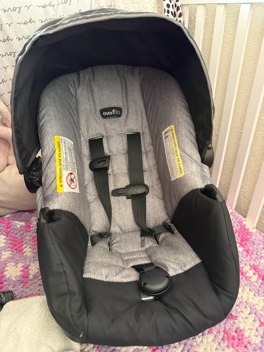 Grey and black infant car seat from Evenflo. This seat is suitable for infants and is used. The hood is manageable it just got bent a bit so it’s wonky sometimes. Trying to get it out of the way to move!