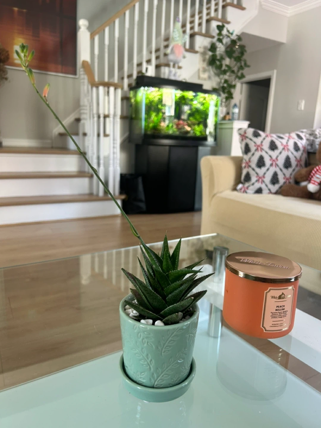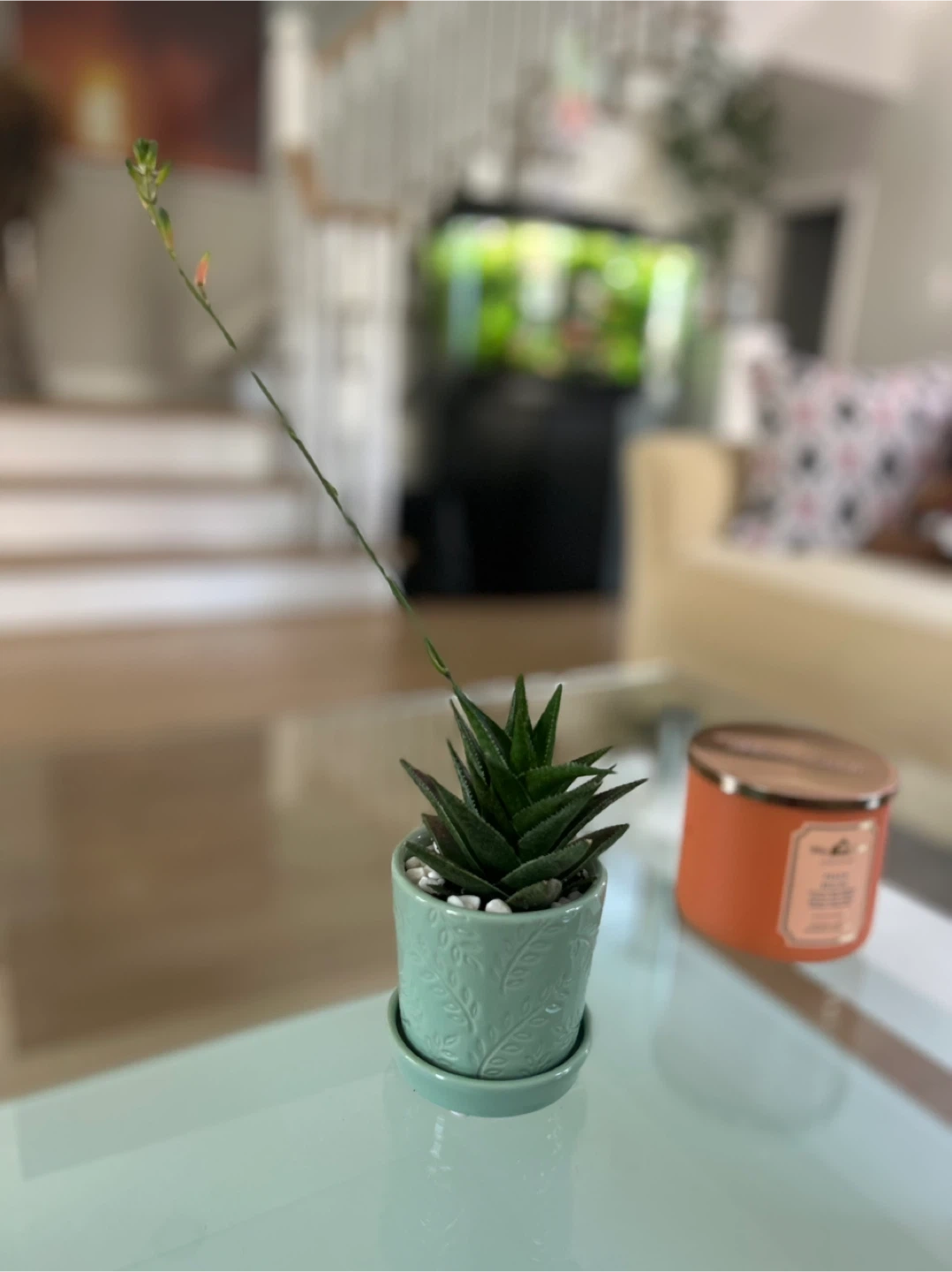 Healthy succulent plant in a mint green decorative ceramic pot with drainage saucer. White pebbles on top. Adds a touch of green to any space!