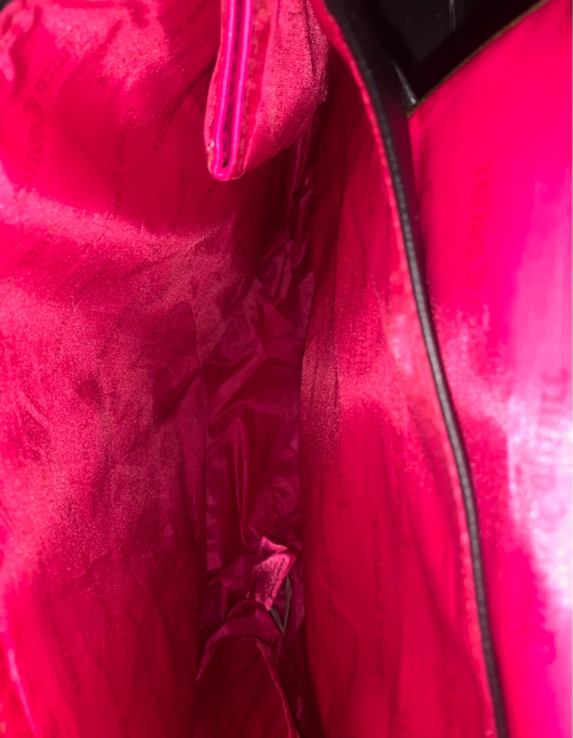 This Juicy Couture backpack is black with vibrant pink sides and a matching interior. It features adjustable straps for comfort. A great bag for everyday use!