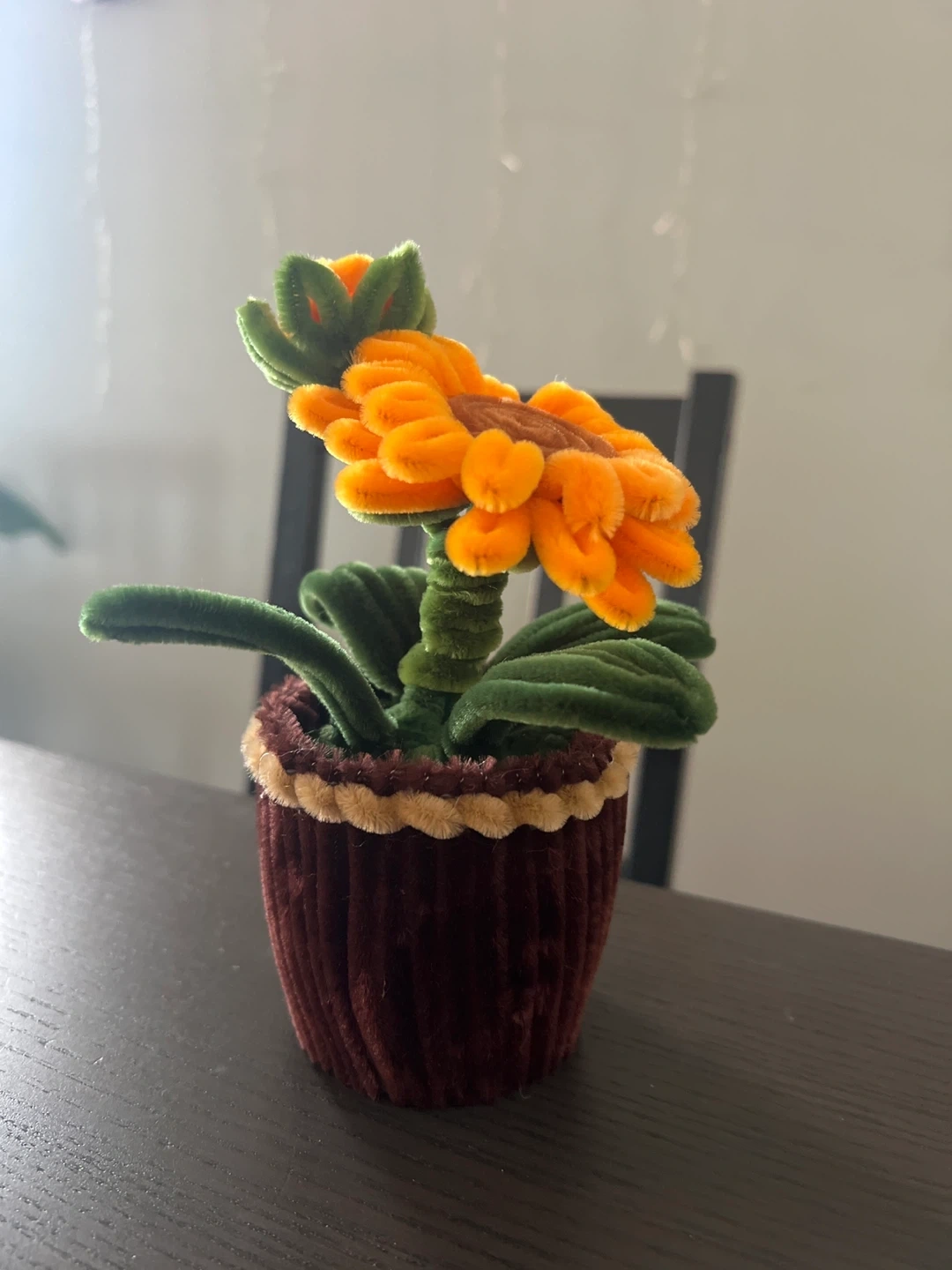 Mother’s Day gift - A cute handmade sunflower made from pipe cleaners. It's in a brown velour pot with a decorative trim. The stem and leaves are green pipe cleaners.