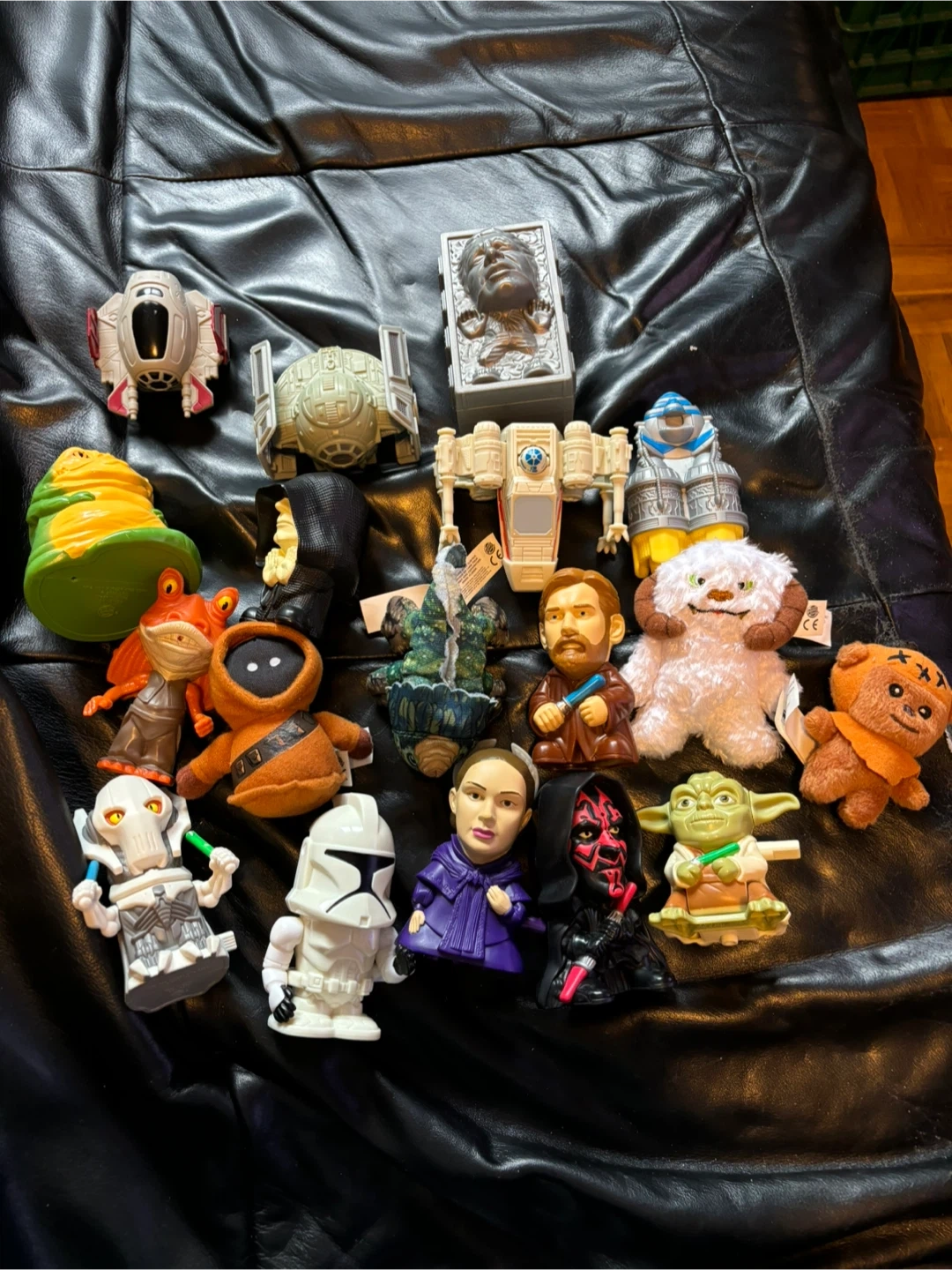 Selling a collection of Star Wars toys from Burger King kids' meals! Lot of 17 Star Wars Burger King toys included Jedi star fighter Victor leader tie fighter X wing fighter Anakins podracer Jabba the Hutt Emperor palpatine Dragon Obi wan kenobi Wampa Wicket Jar jar binks Jawa General Grevious Clone trooper Padme Darth maul Yoda Includes empty Han Solo in carbonite as well