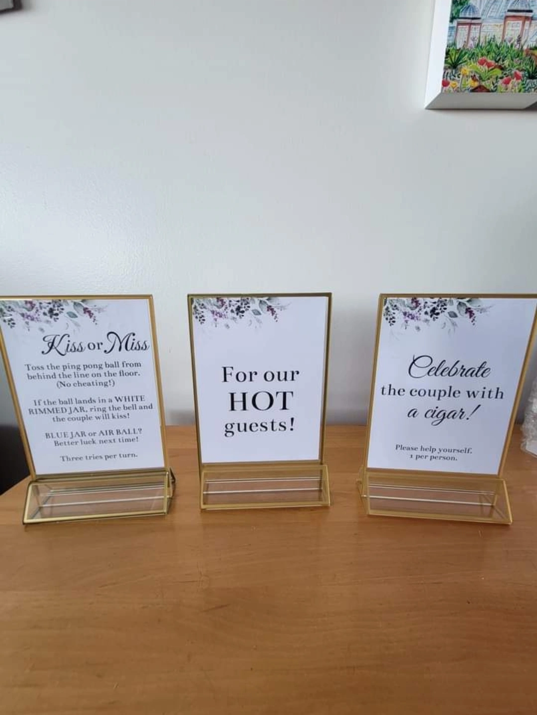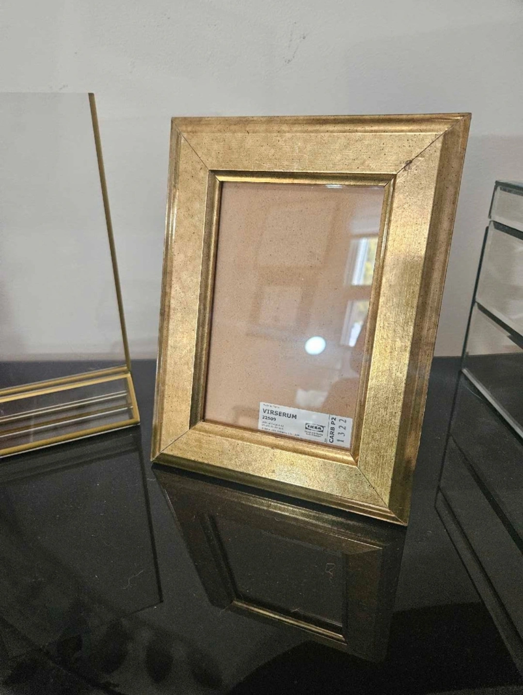 13 gold frames = Size: 4 x 6 inch And 4 transparent frames = 5x7 inch acrylic gold rimmed frames with stand, can be used for photos or signs All in great condition. Can be used as centerpieces, with numbers, or for signs Used twice for bridal shower and wedding.