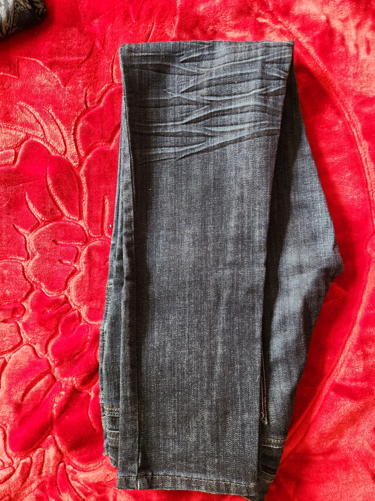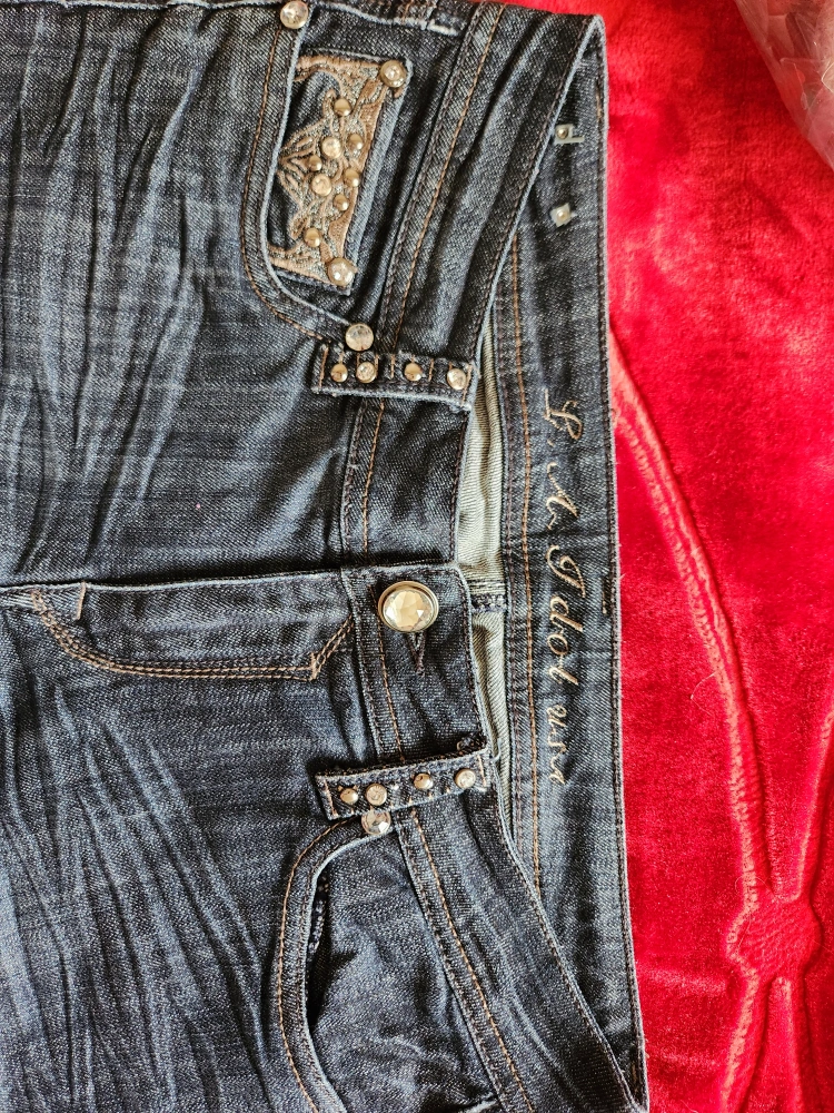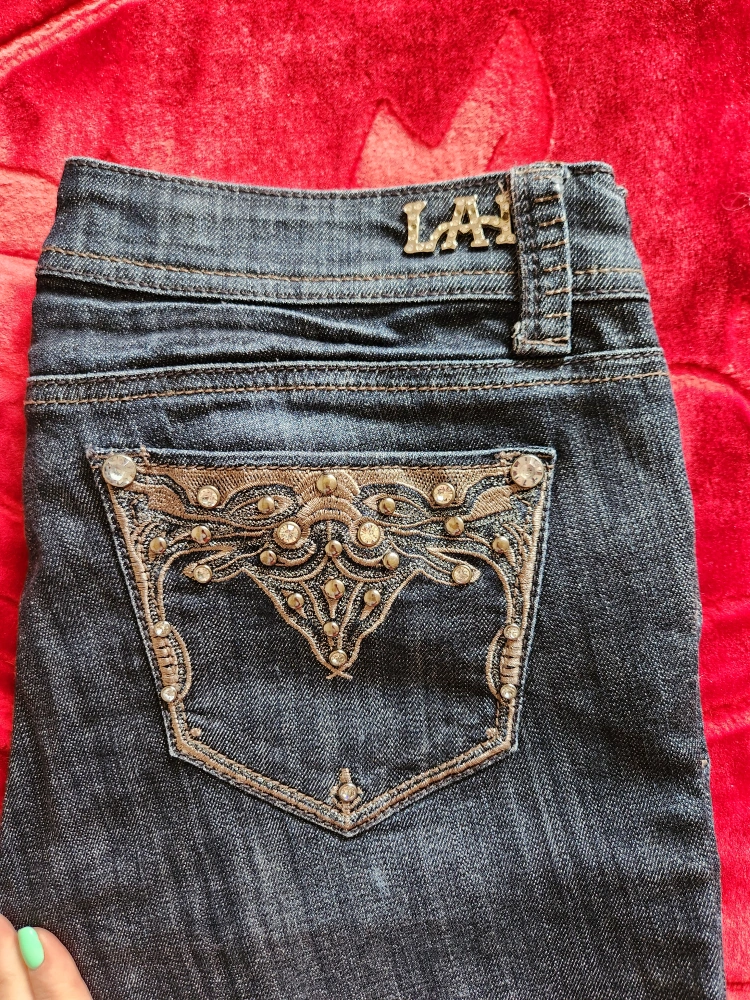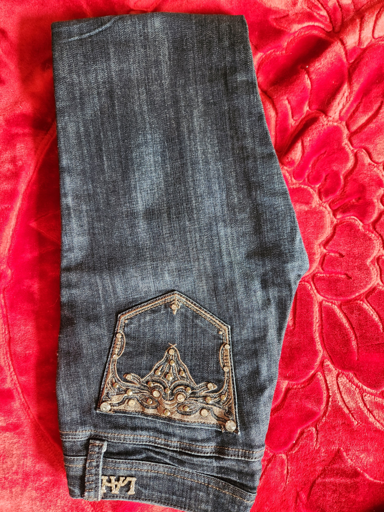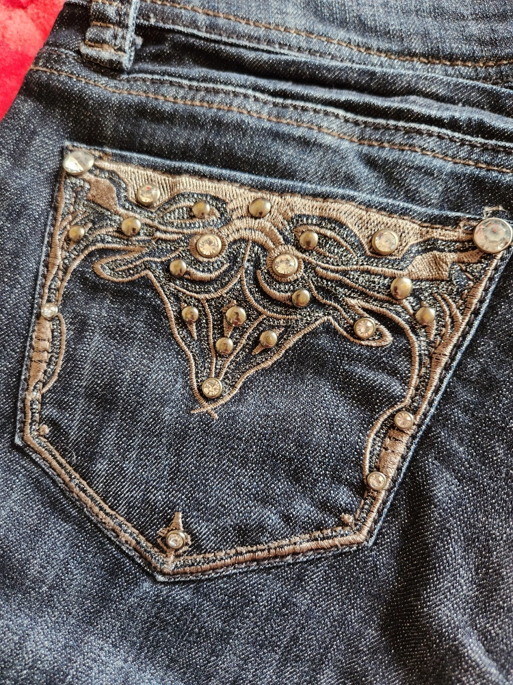 982Beautiful embroidery on the pockets, straight leg, fits smaller than actual size. I have gained weight over the last year and need to purge so as to buy new clothing.