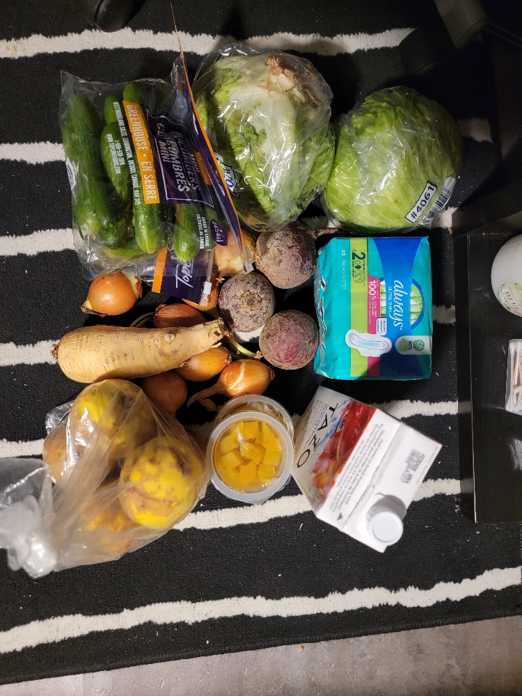 A tazo drink,2 packs of cucumber,some onions,lettuce,female always pad,parsnip and some other stuffs. Need a single picker for all