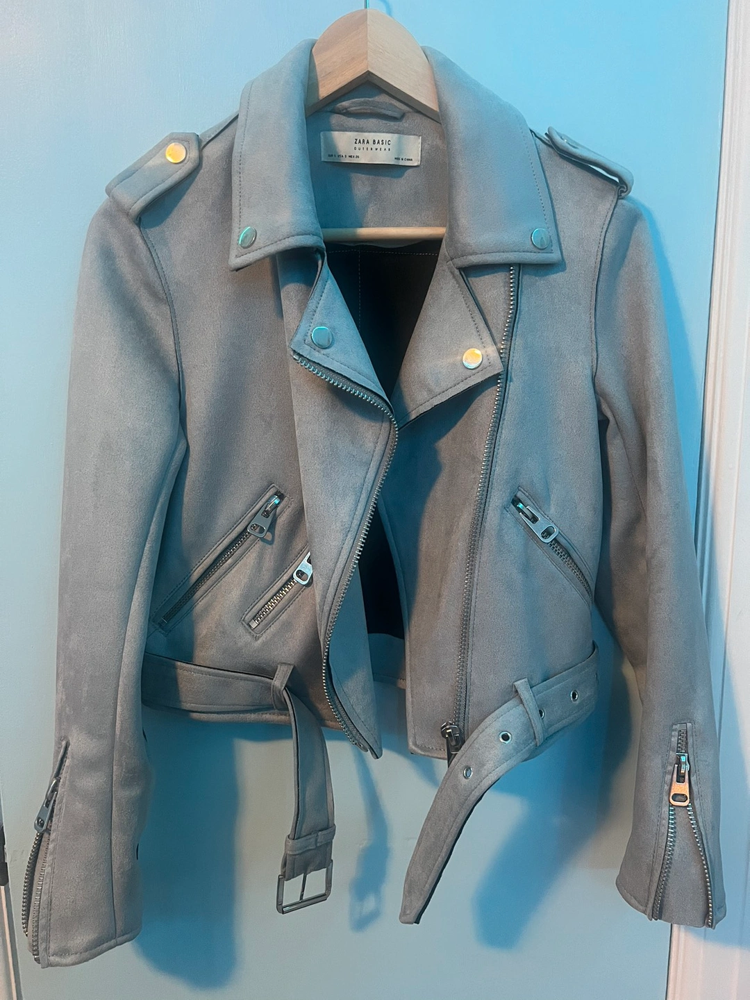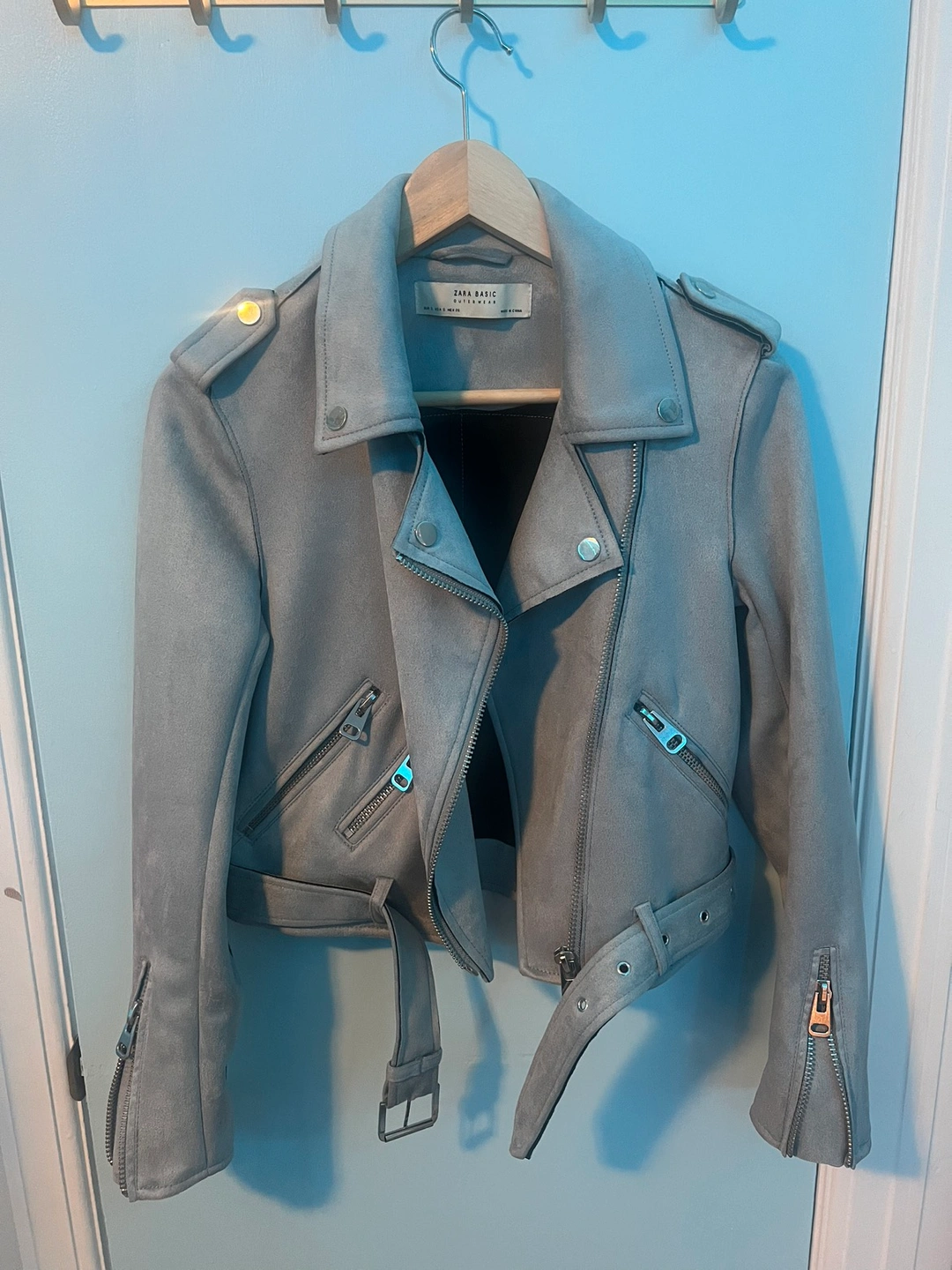 Super cute light blue moto style jacket from Zara. Light weight and perfect for spring. Style it with jeans or a dress! Cash or E-transfer! Thanks!