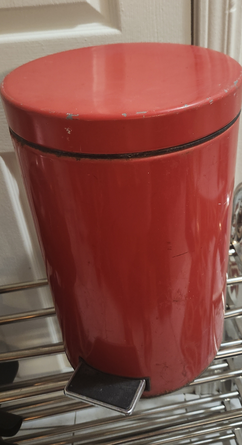 Small red 5 L Stept-on garbage can. It's been used. and with a little rust on the handle of the bucket, but otherwise, it still has life .