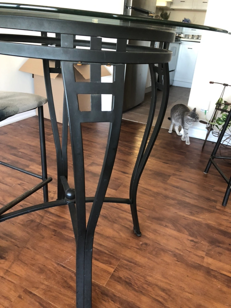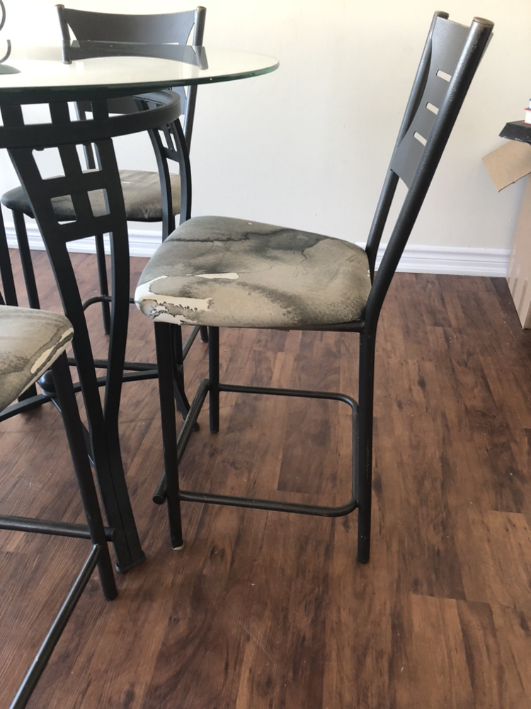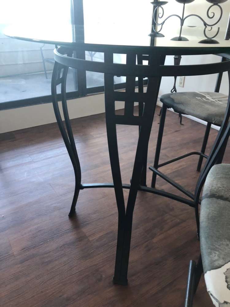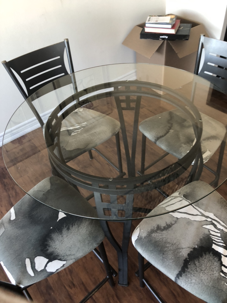 Glass is half an inch thick slight smoky color. Super good condition. Could also be used on a patio. Includes four chairs