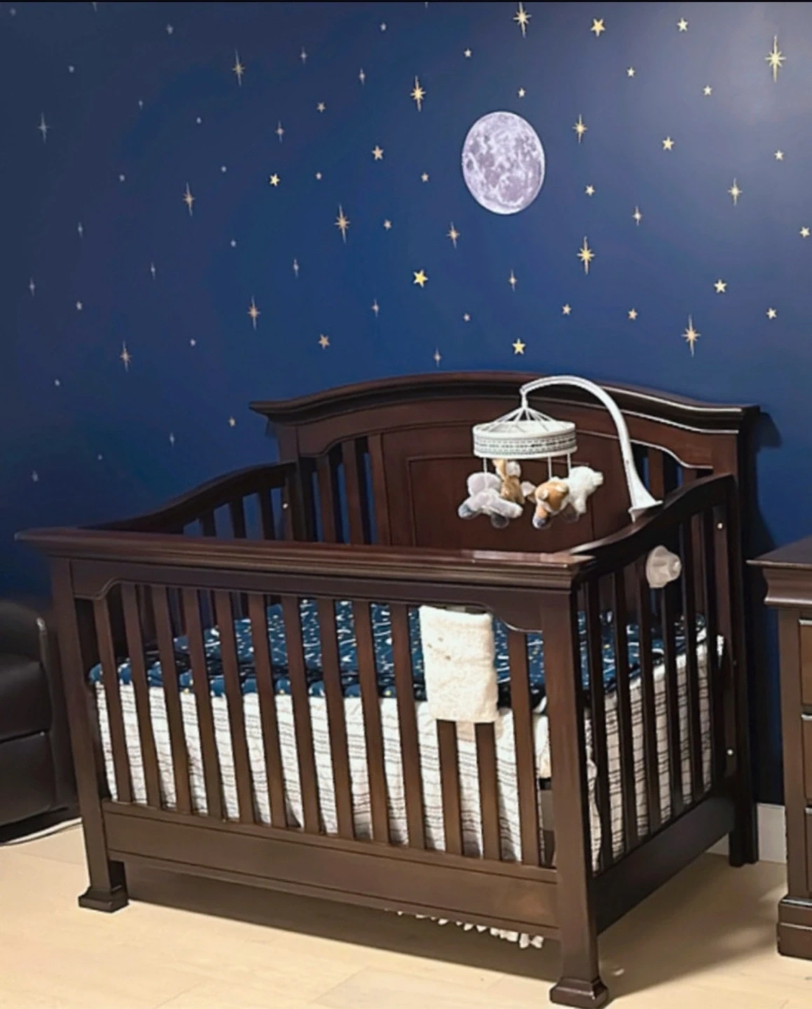 Dark Wood Baby Crib with Mobile