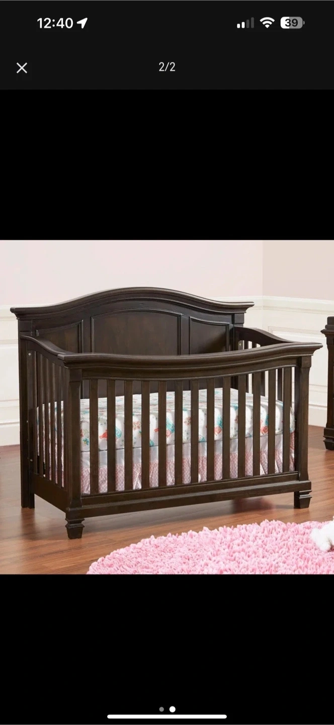 This baby's crib, finished in a dark brown, is in great condition and ready to provide a cozy sleep space for your little one. It’s sturdy and stylish, blending seamlessly into any nursery decor.