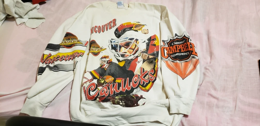 years old? 20 + years. great condition. I grew up. it fit me fine when I was years, years young. its like a medium men's. I now wear Extra Large to XXL? How time flies. its not your average hockey item. its a collectors item. it's in great condition for your son, daughter, whoever loves the Canucks i wish I can still fit it.