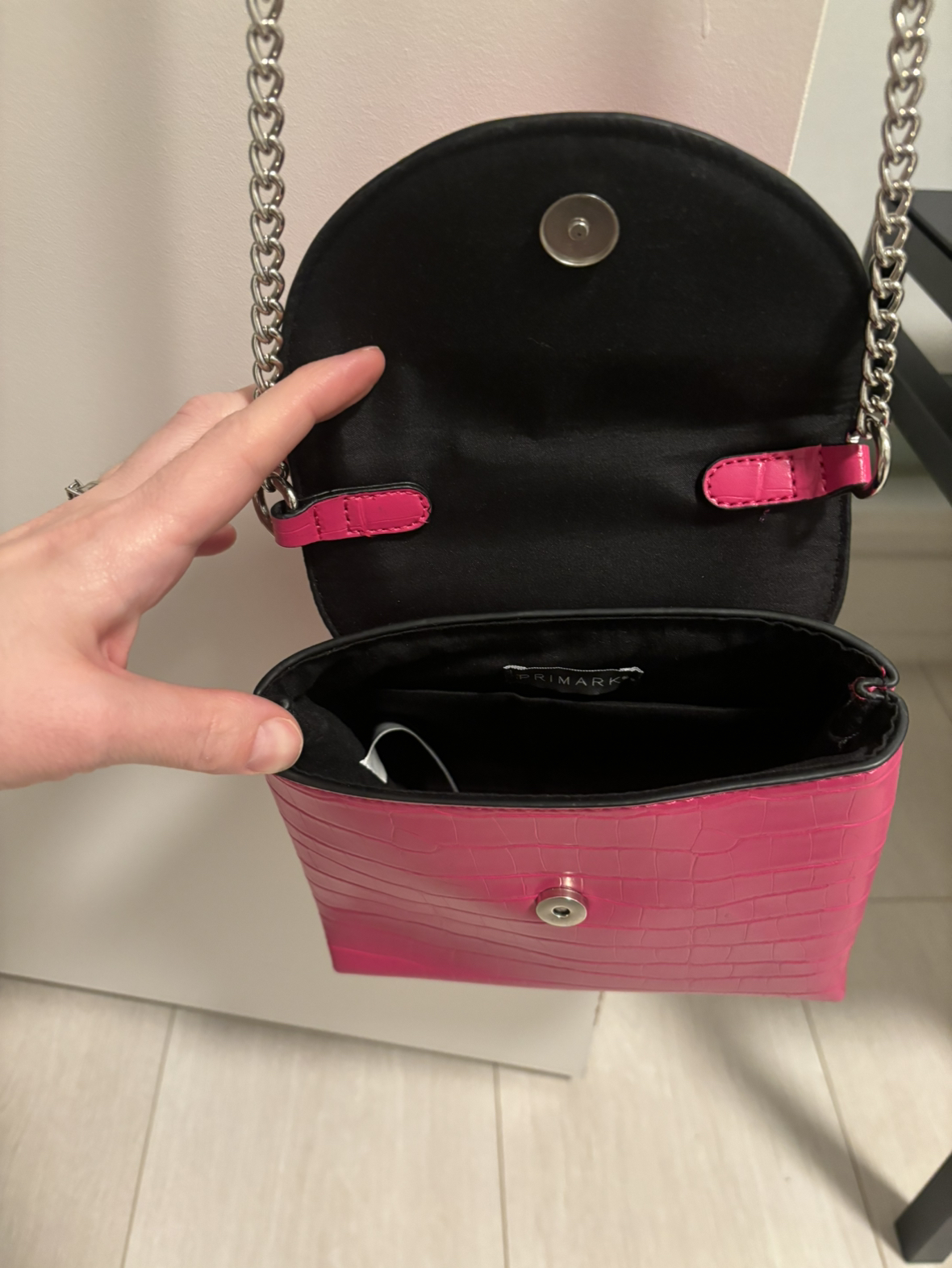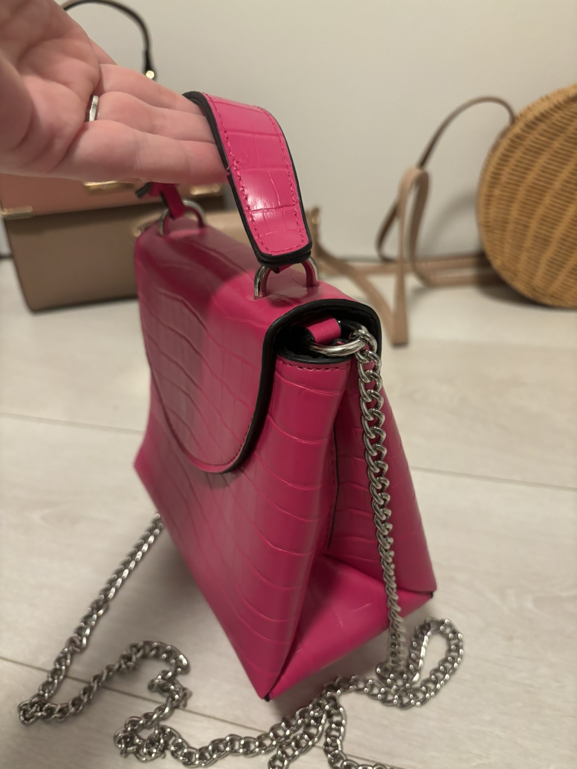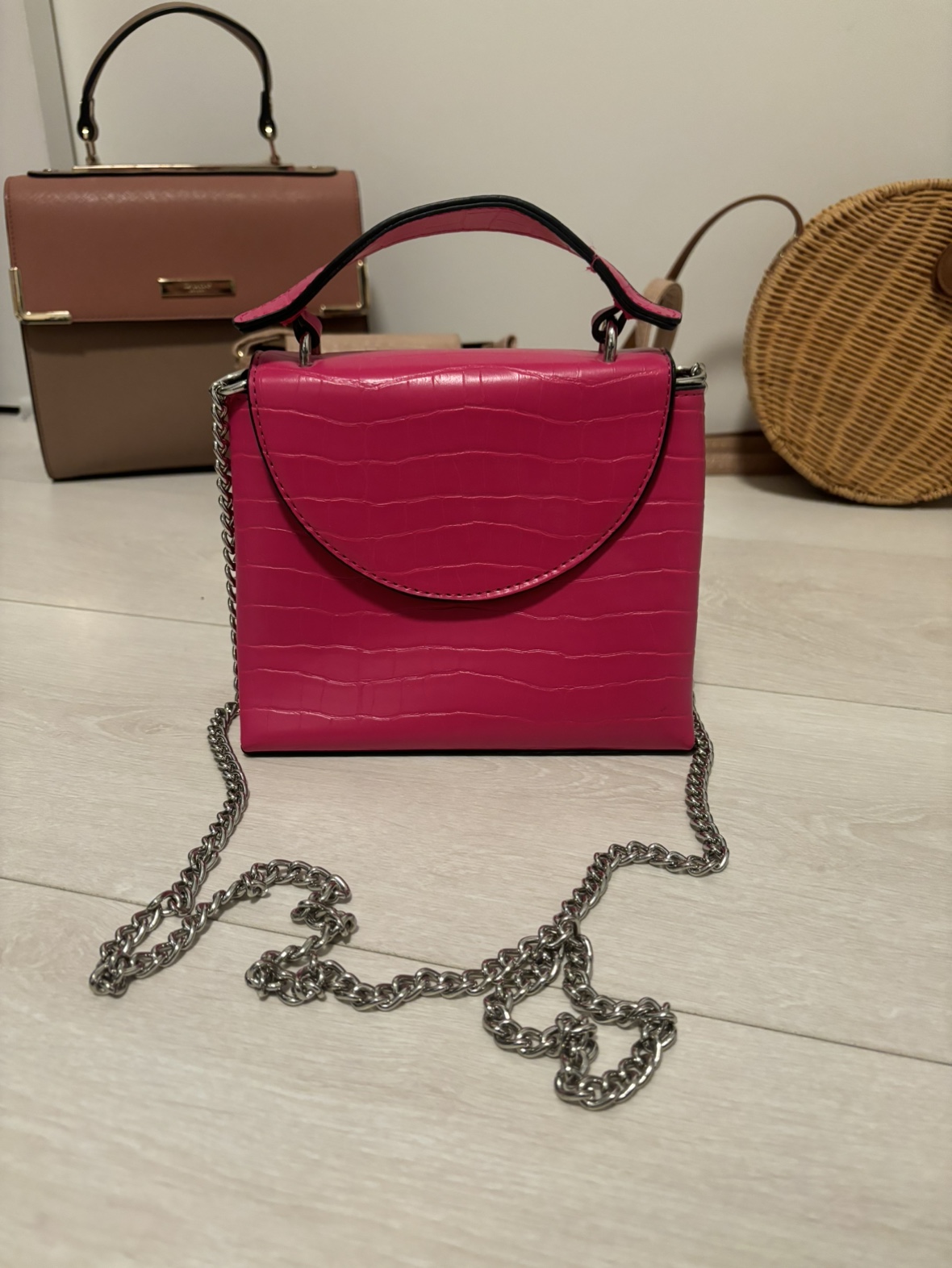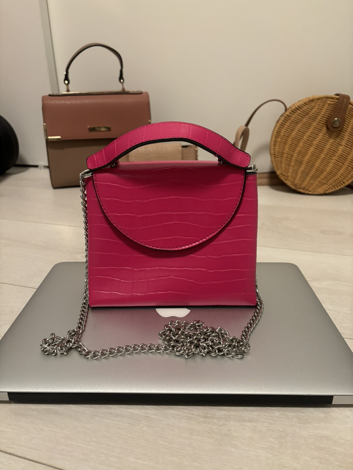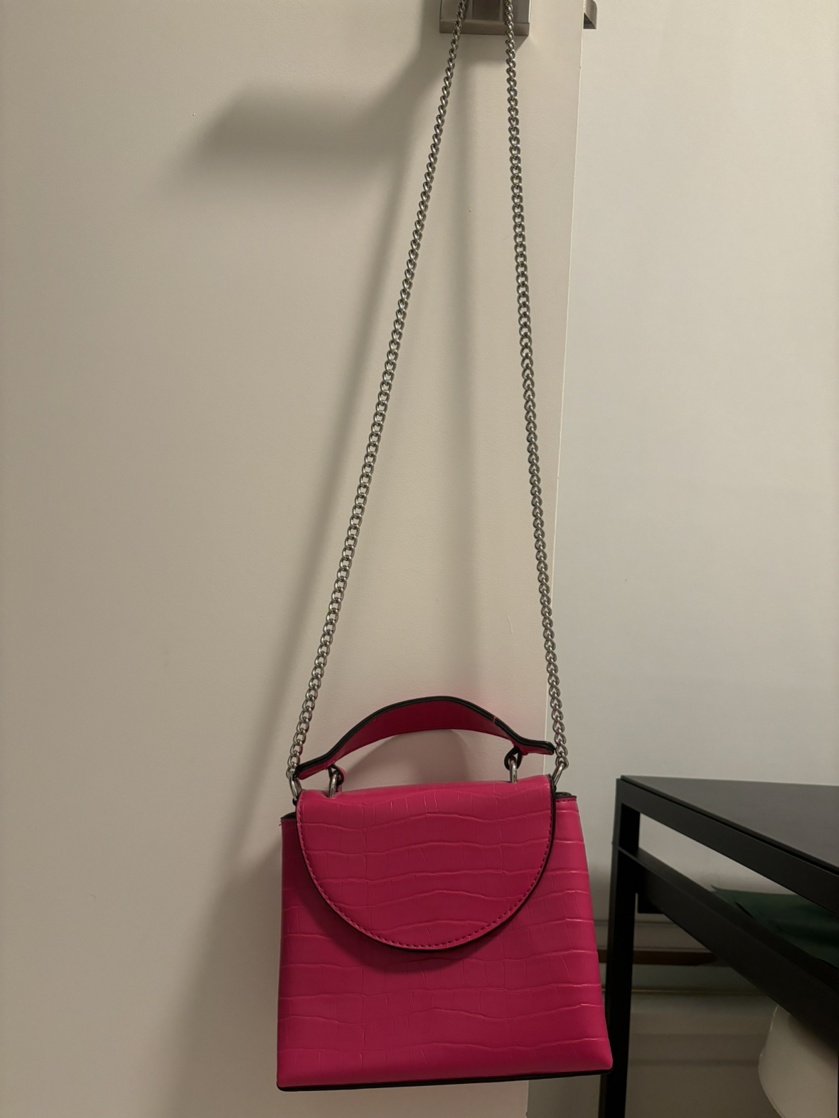 Pink purse, never used. Silver details, see pictures for handle and metallic crossbody strap. Perfect condition!