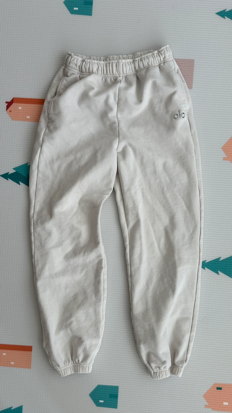 Alo Yoga cream/off-white sweatpants. Small, but I think it is closer to a Small/Medium, because it is pretty loose on me and I am a “true to size” small.