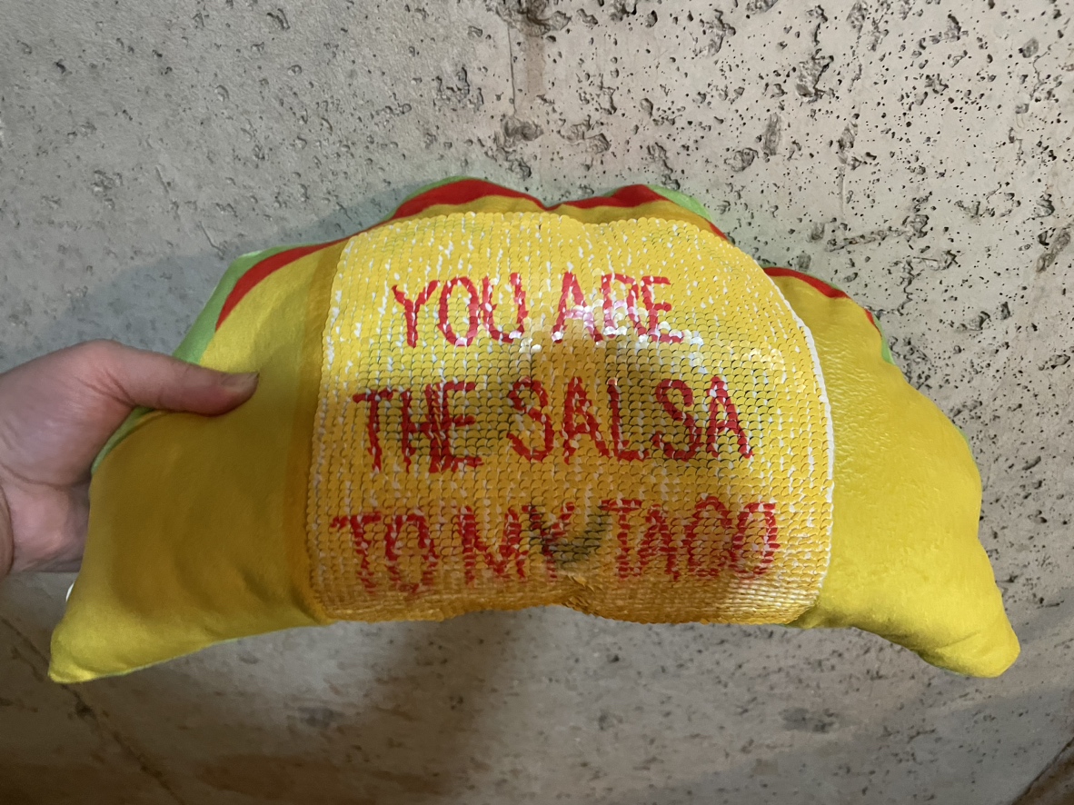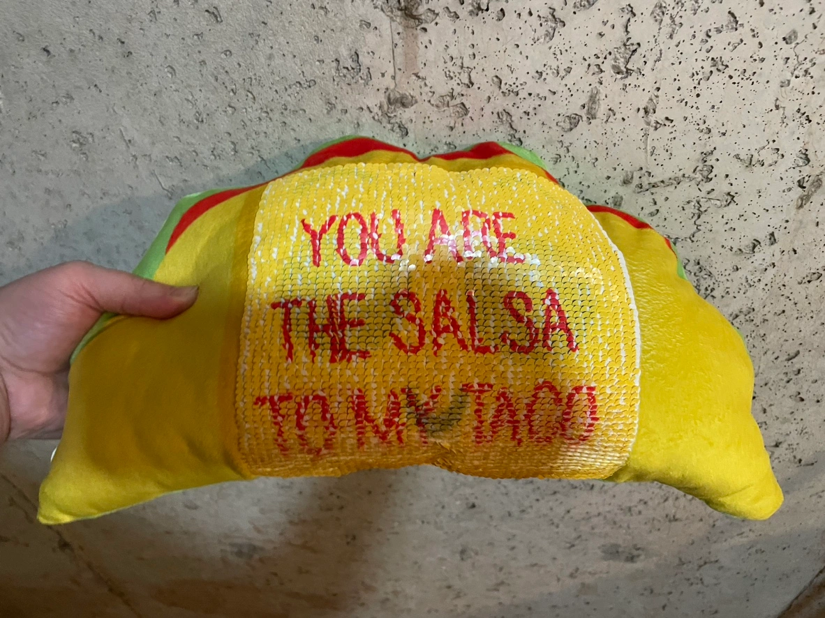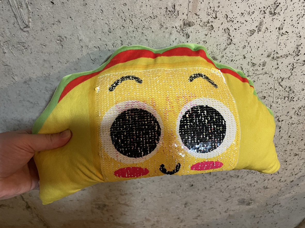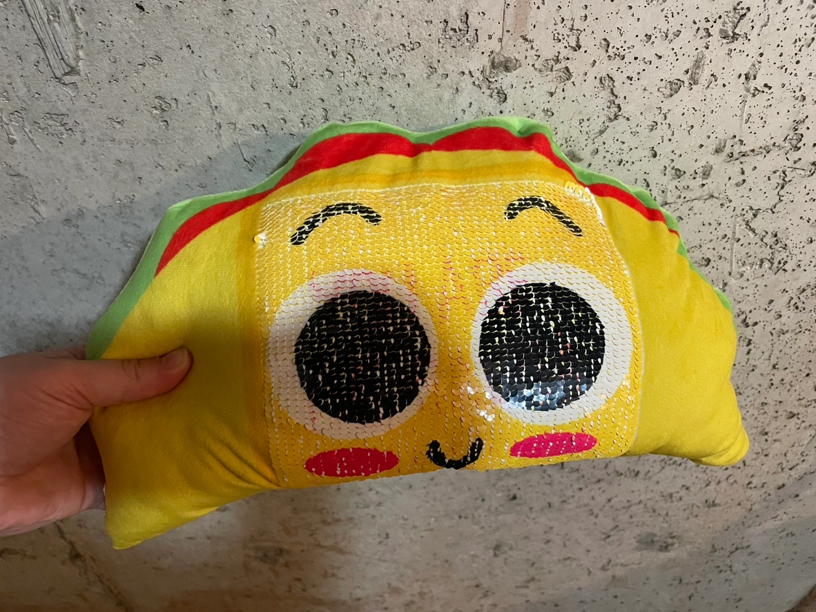Cute taco stuffie! It changes when you flip the front, first it has eyes then it says “you are the salsa to my taco”