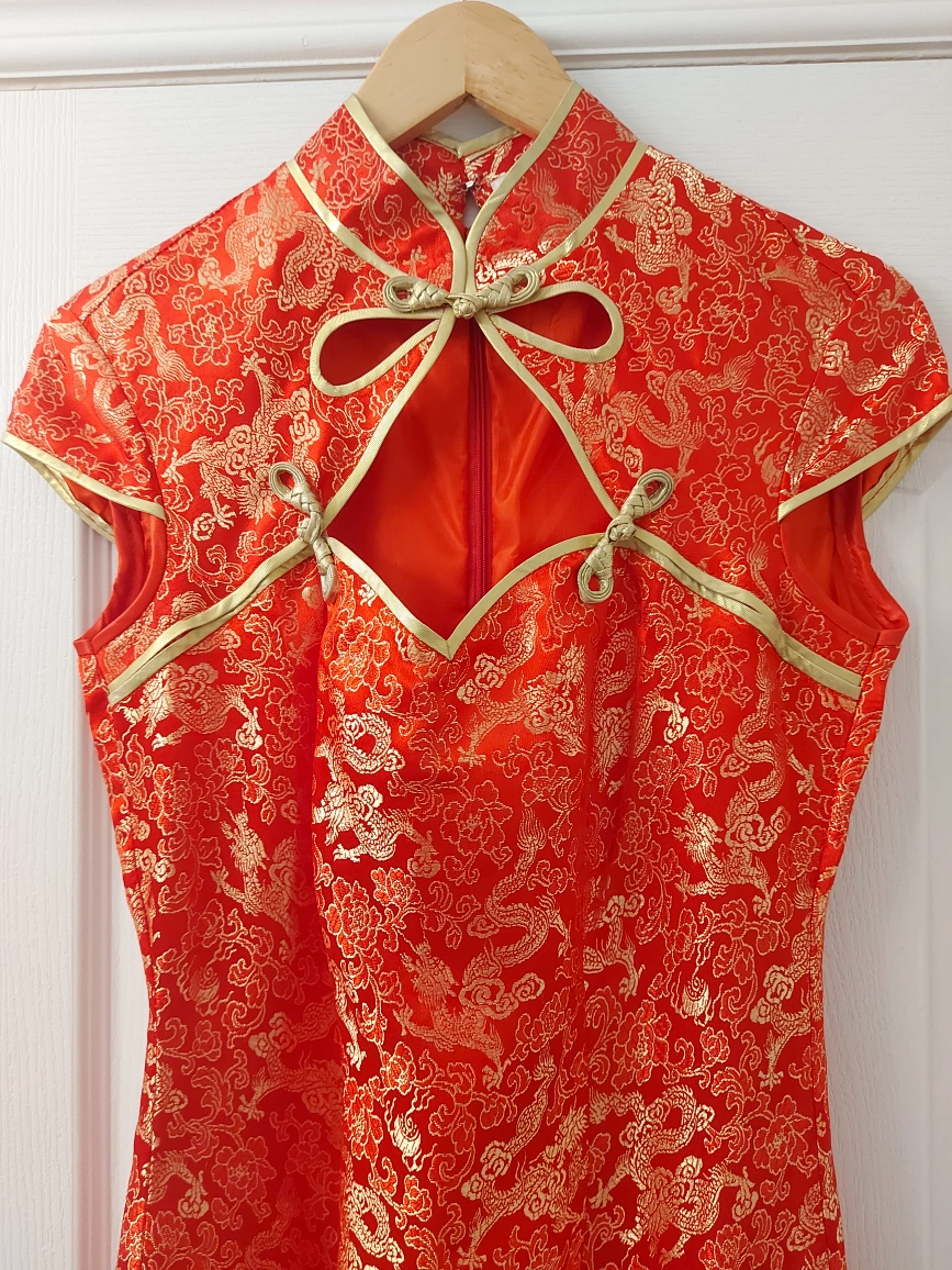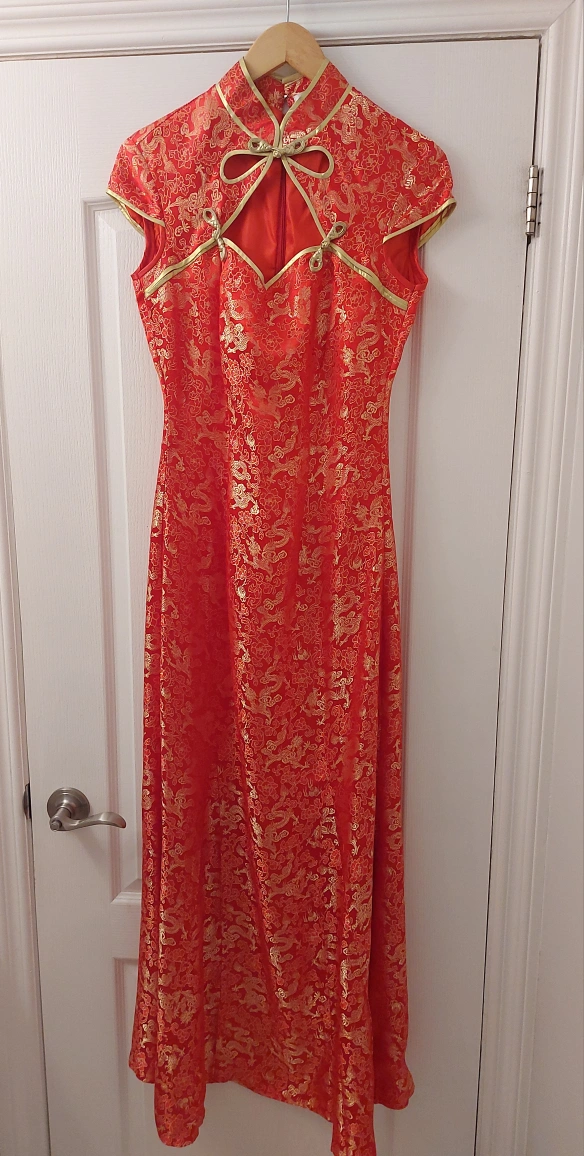 Chinese traditional dress. Only worn once for a couple of hours. Roughly size 4. It has been taken in without the extra fabric being cut off, so it can be taken back out. It has a slight trumpet shape at the bottom. Ankle length on me at 5"9". Able to meet along TTC Line 2 in Etobicoke to St. George or south Mississauga.