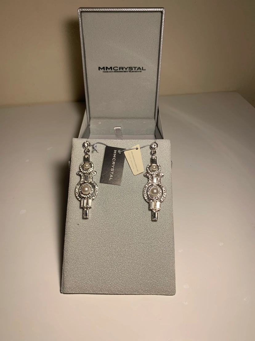 A BRAND NEW AND NEVER WORN, amazing set of large Swarovski Elements dangle earrings designed by MM Crystals. These robust earring feature a very impressive array of brilliant round, large round, and baguette cuts adorned with genuine pearls!