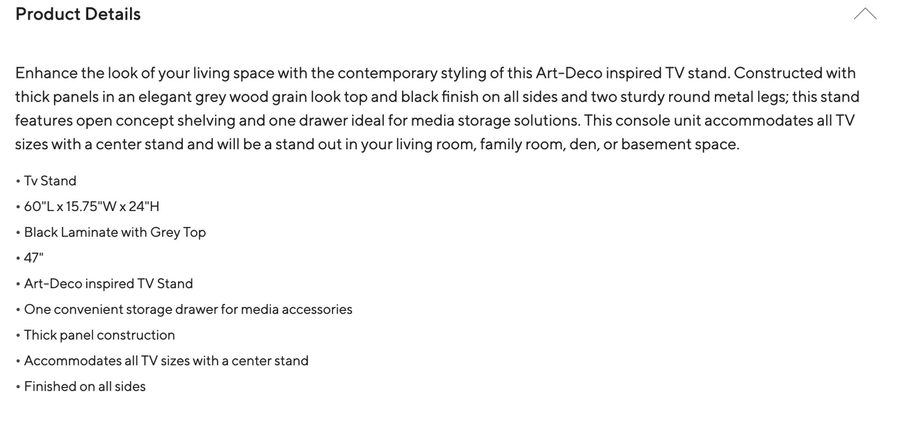 Enhance the look of your living space with the contemporary styling of this Art-Deco inspired TV stand. Constructed with thick panels in an elegant grey wood grain look top and black finish on all sides and two sturdy round metal legs; this stand features open concept shelving and one drawer ideal for media storage solutions. This console unit accommodates all TV sizes with a center stand and will be a stand out in your living room, family room, den, or basement space.