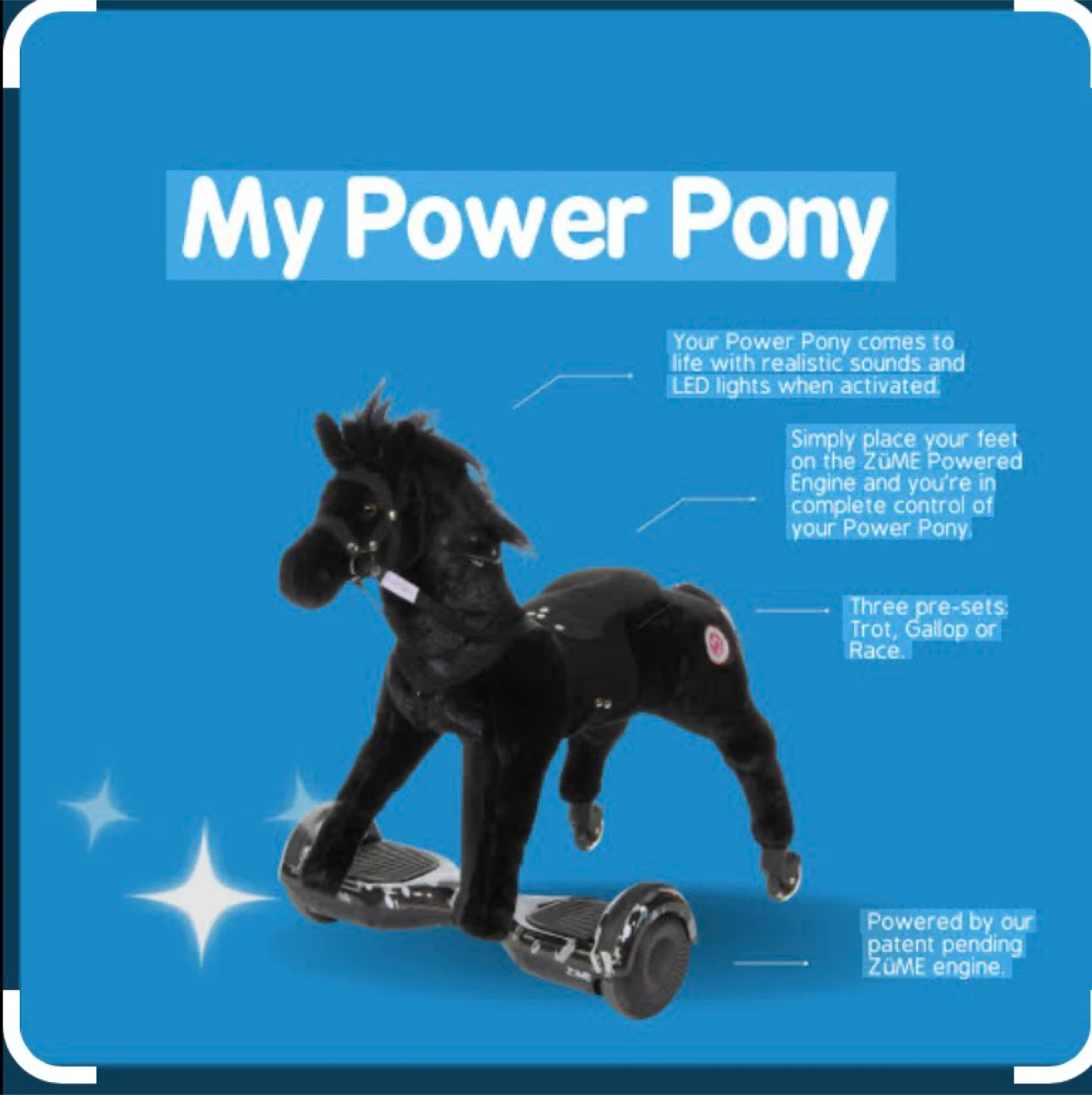 This is the My Power Pony, a ride-on toy that comes to life with realistic sounds and LED lights. It's powered by a patent-pending ZÜME engine and has three pre-sets: Trot, Gallop, or Race. Simply place your feet on the engine for complete control of your Power Pony!