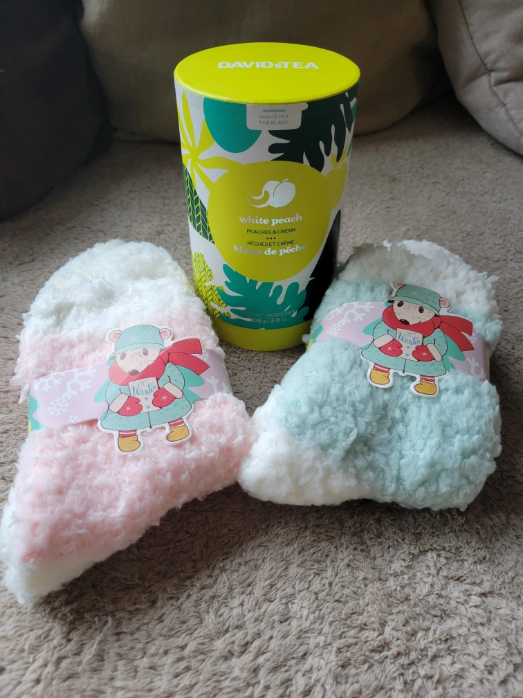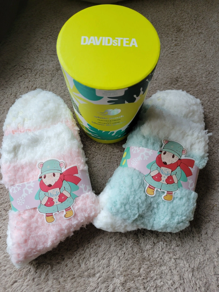 2 pairs of fuzzy socks with non-slip bottoms and 1 container of white peach David's Tea. Selling all items together as a bundle set. I was gifted these items but haven't used any.