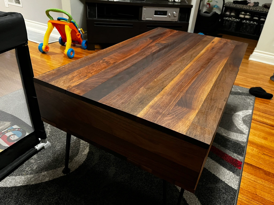 Custom pure walnut coffee table with hydronic life t top and hidden compartment