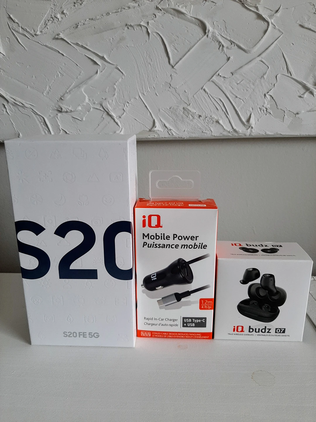 Brand new in box S20 FE 5G edition (128 Gbs, Cloud Navy). Currently selling on Samsung/Best Buy/etc for $791 taxes in (this includes $250 black friday discount from original price of $950). I'm asking for $580 firm. That's an additional $211 discount totalling to $493.50 discount on a brand new phone. I've taken a photo of the IMEI for easy reference if you want to look it up for peace of mind that its not reported stolen or blacklisted. I'll also be throwing in brand new in box IQ Budz 07 true wireless earbuds ($35 retail price) and IQ Rapid in car charger ($25 retail price). Both never been used.