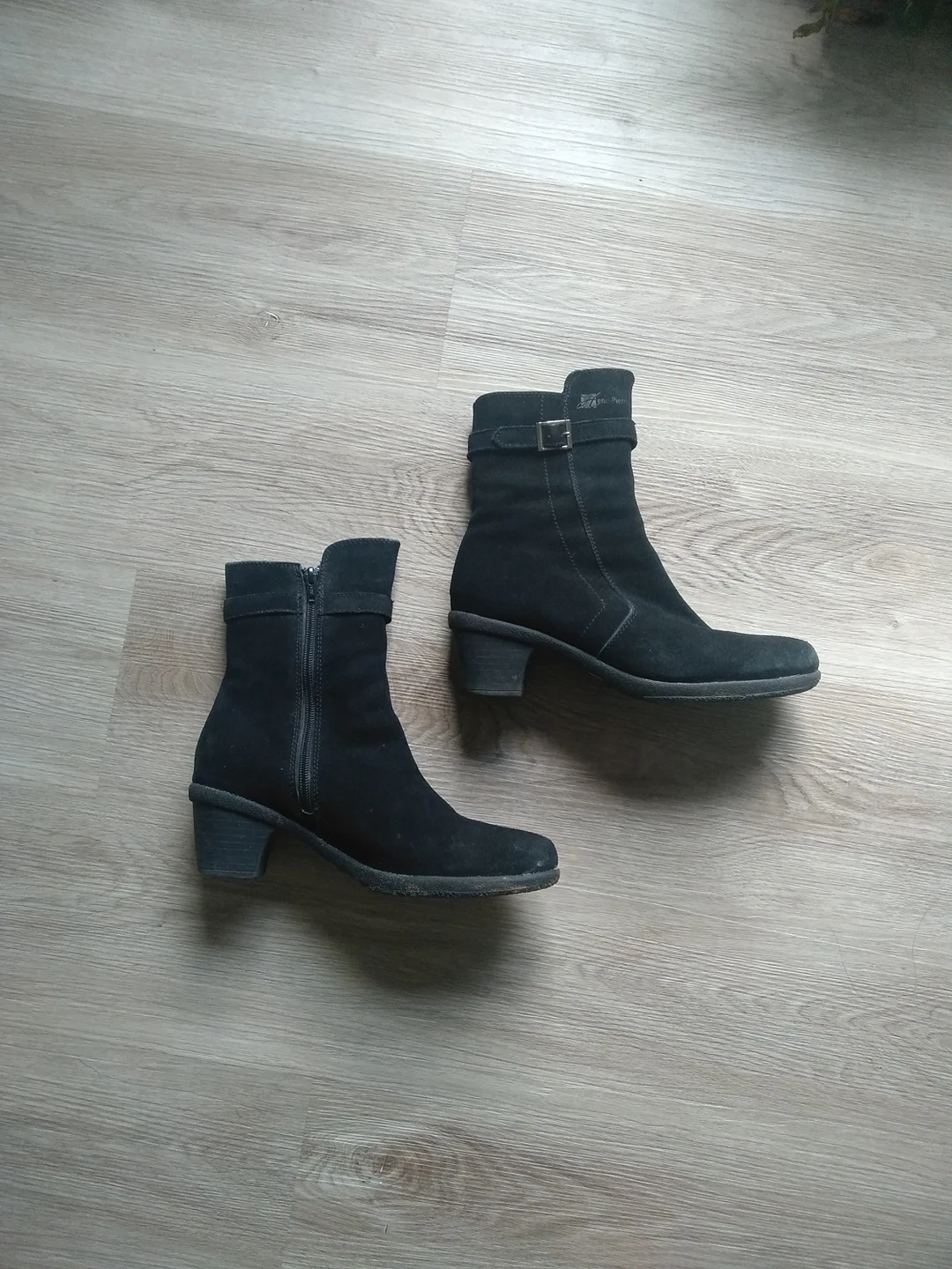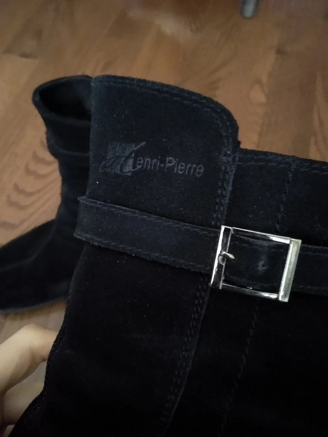 Real suede. Barely used. It says size 9 but my mom says it fits more like 8.5. It has a fur lining on the sides (not on soles). Great brand- Henri-Pierre. I believe this was over $100. Comfortable, but my mom can't wear heels anymore. Feel free to try it on