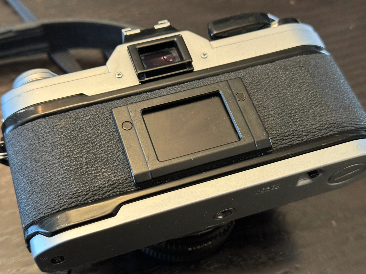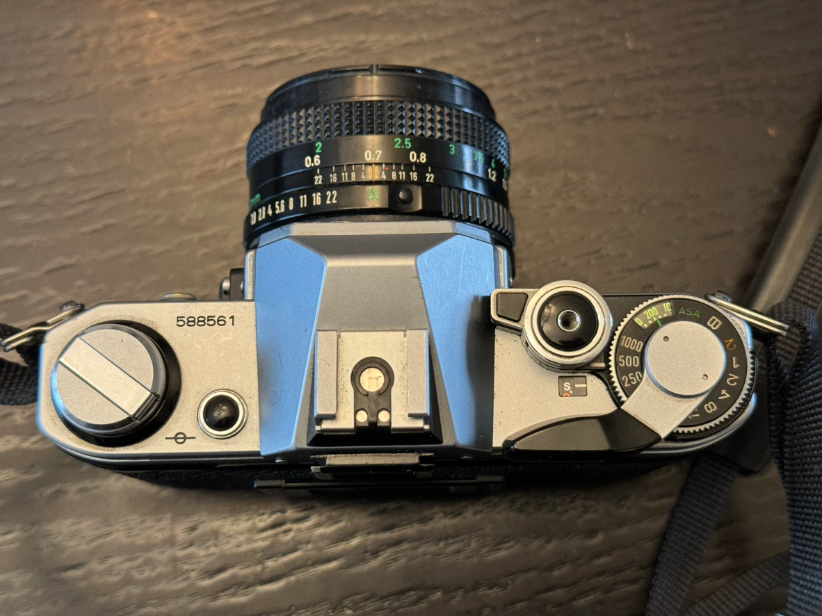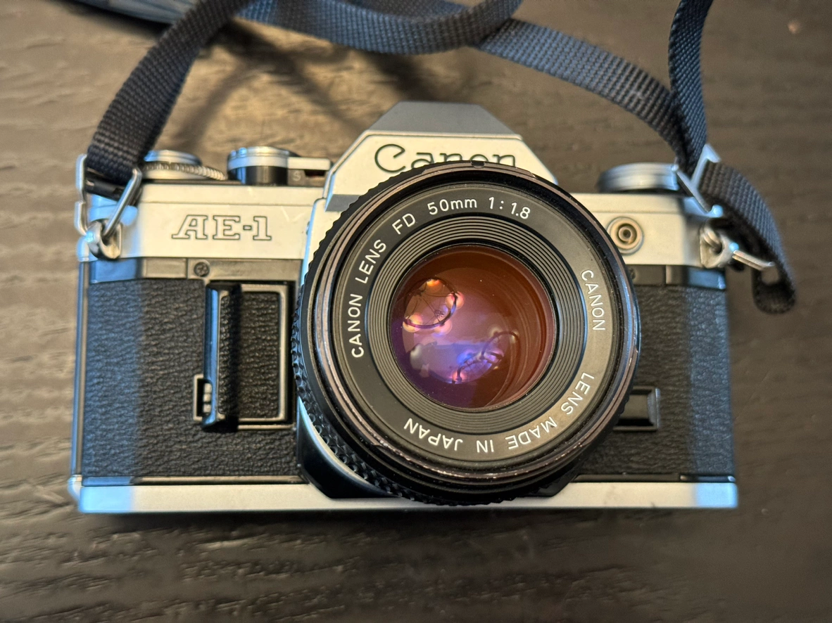 Selling a Canon AE-1 film camera with 50mm 1.8 FD lens.