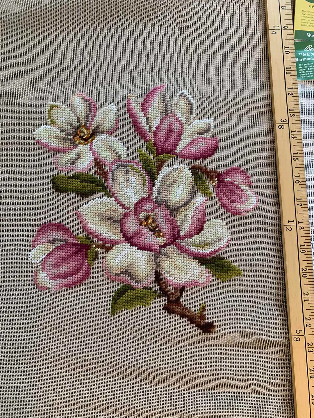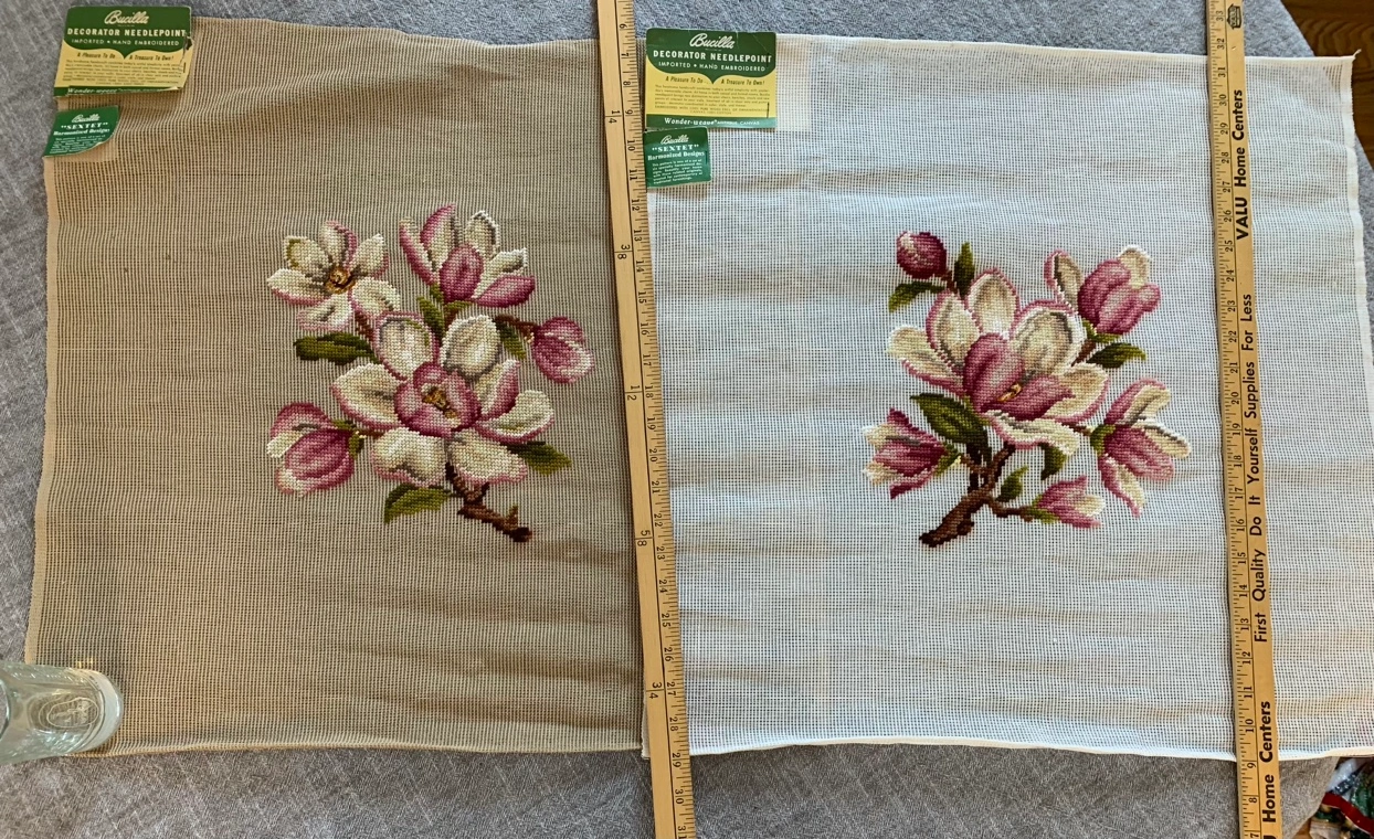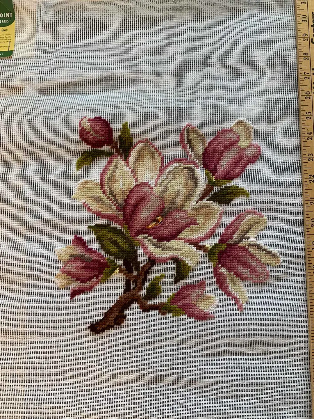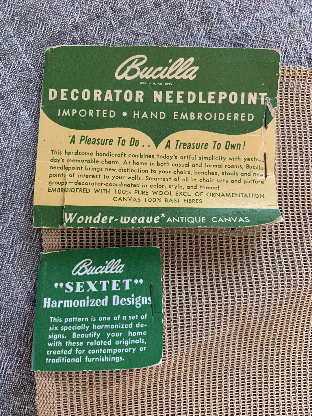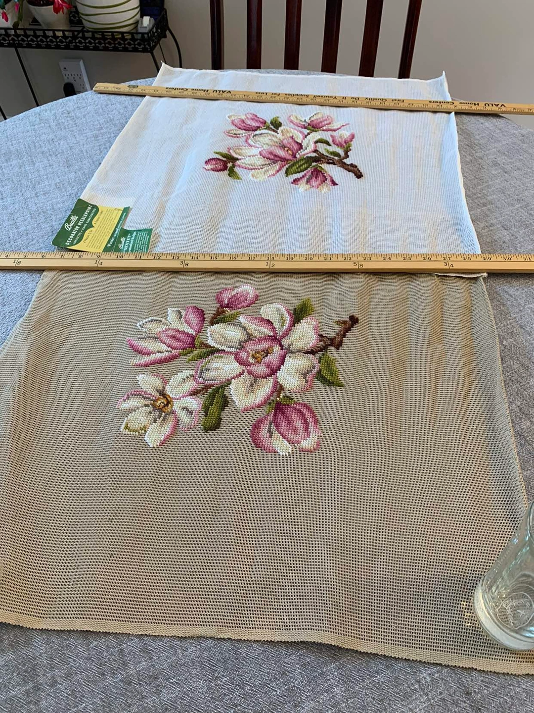 A set of matching vintage Bucilla 23" X 23" cotton canvases with pre worked wool floral center. Vintage but never completed this set of matching canvases (same flower and colors) came with the center floral pattern already completed, all you need to do is select a background color and complete the canvas. Use this really nice design for chair seats or a set of matching pillows. $40 for both.