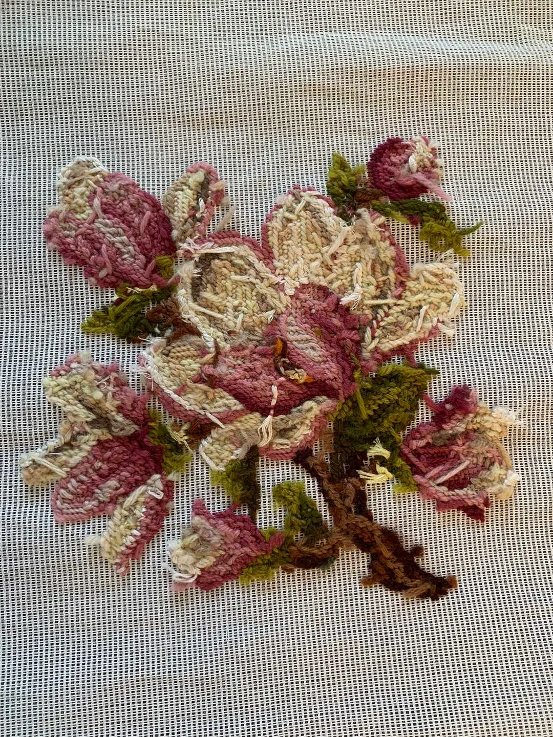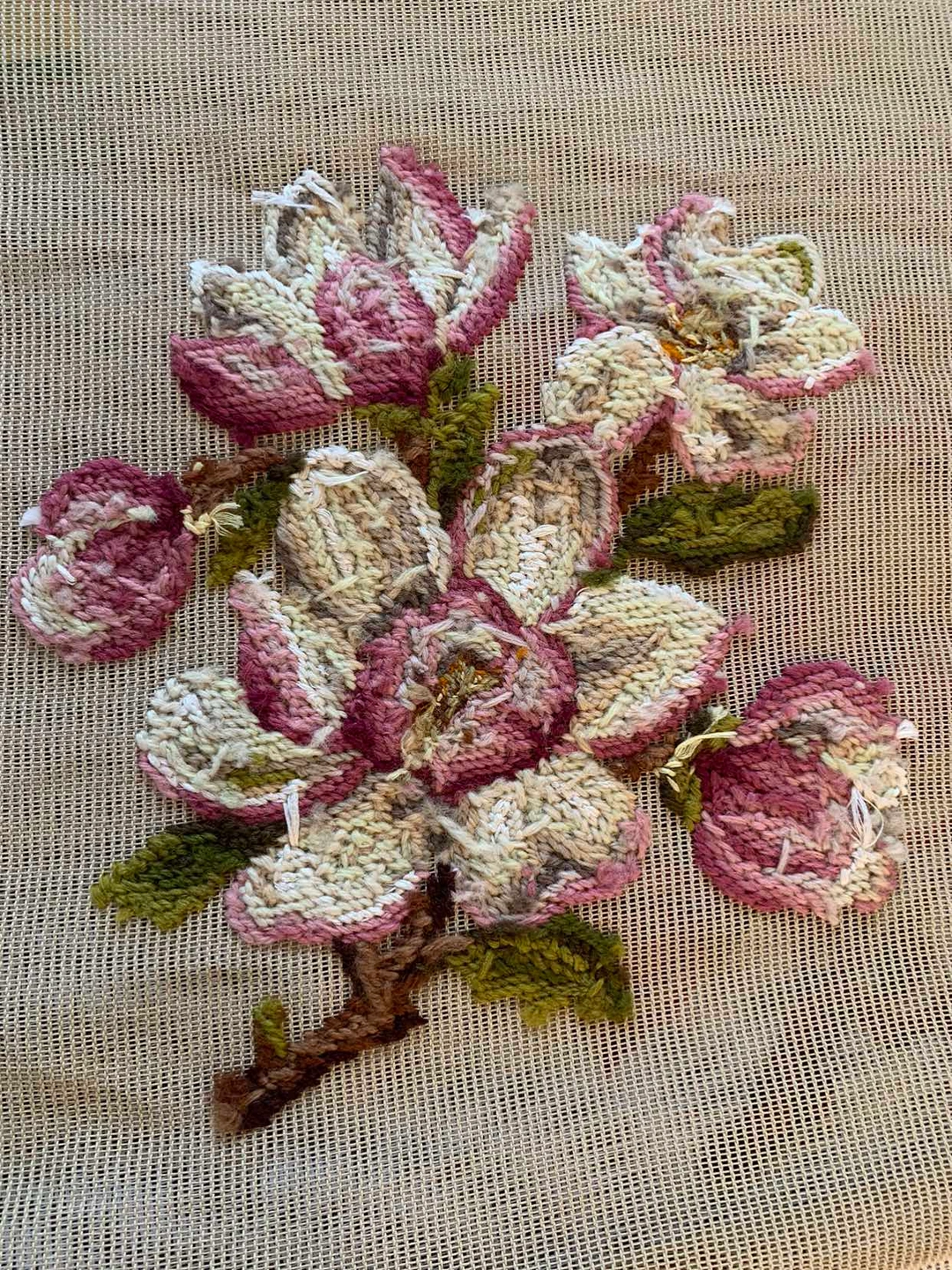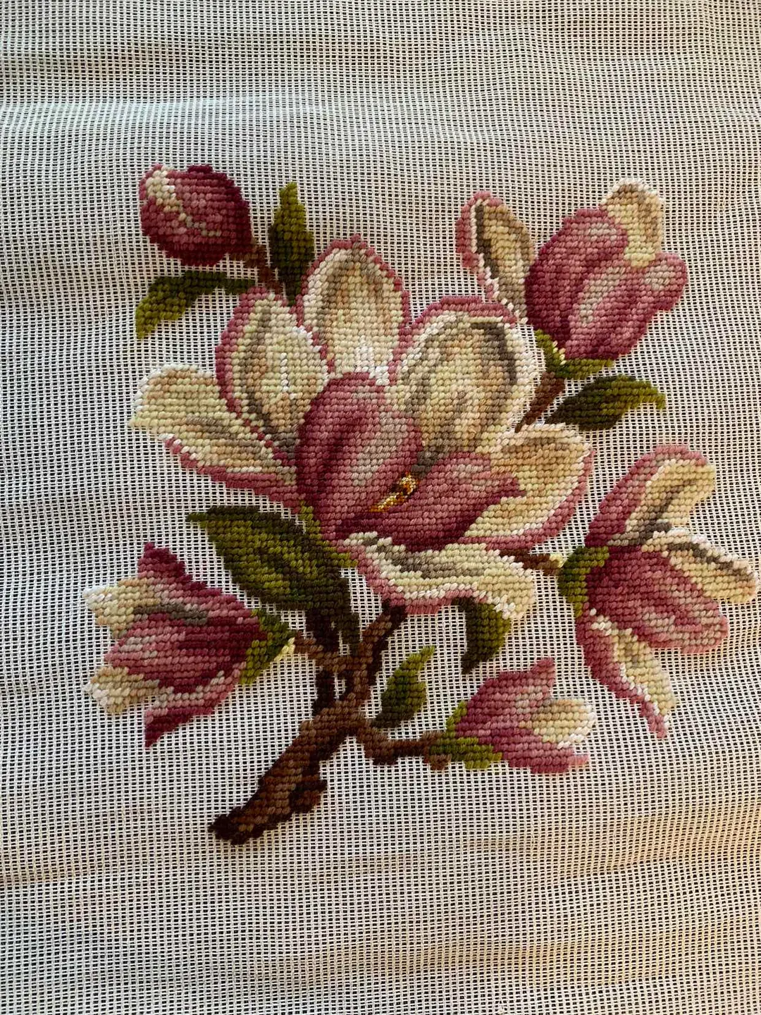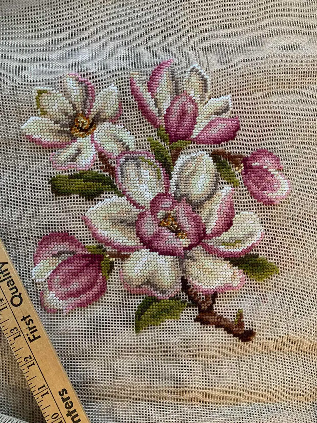 A set of matching vintage Bucilla 23" X 23" cotton canvases with pre worked wool floral center. Vintage but never completed this set of matching canvases (same flower and colors) came with the center floral pattern already completed, all you need to do is select a background color and complete the canvas. Use this really nice design for chair seats or a set of matching pillows. $40 for both.