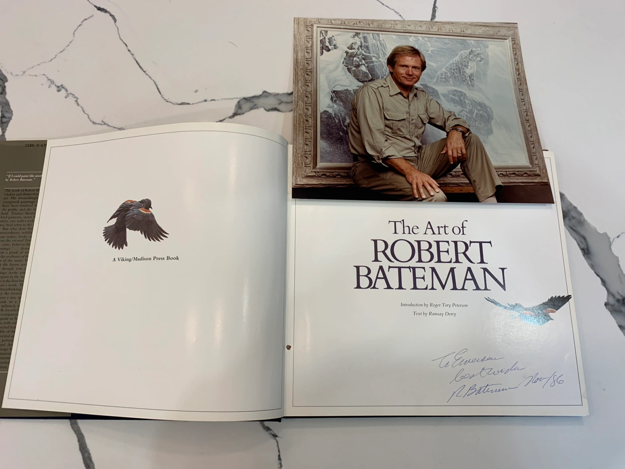 Signed Vintage The Art of Robert Bateman book in very good, like new condition. Signed by Robert Bateman and dated Nov/86. Also included is a 9” x 11” photograph of Mr. Bateman sitting in front of one of his paintings, likely taken at the book signing. If you like Robert Bateman’s art work then this is good addition to your library.
