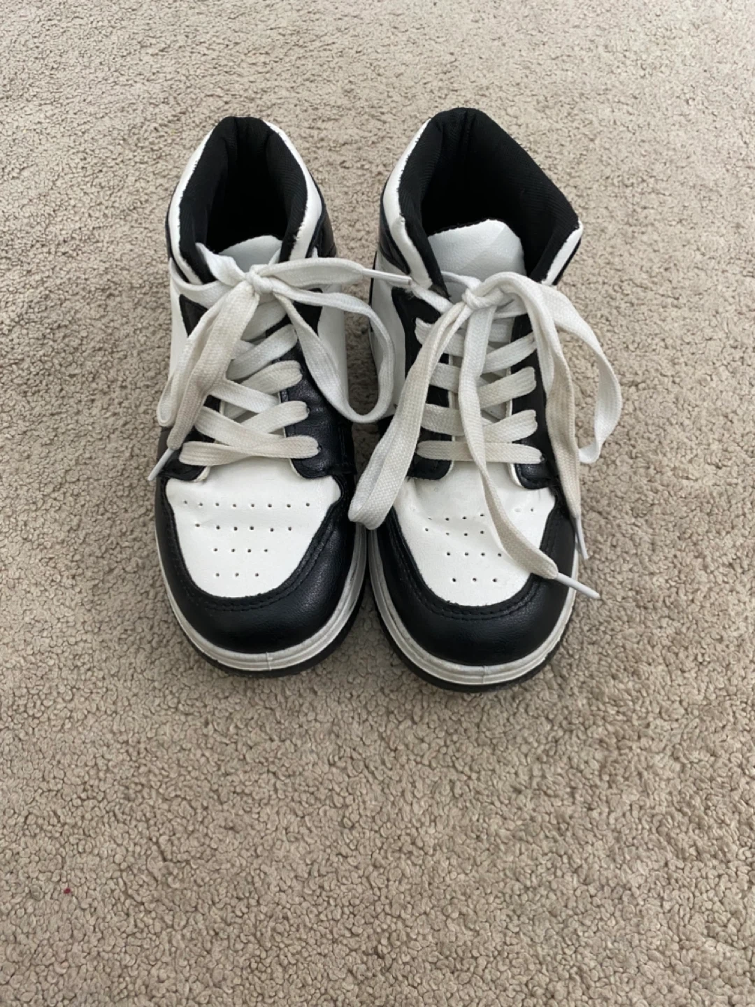 These black and white high-top sneakers are a classic choice for everyday wear. They're made with a synthetic leather material and feature a lace-up closure for a secure fit. The durable rubber sole provides good traction. Great for kids who are always on the move!