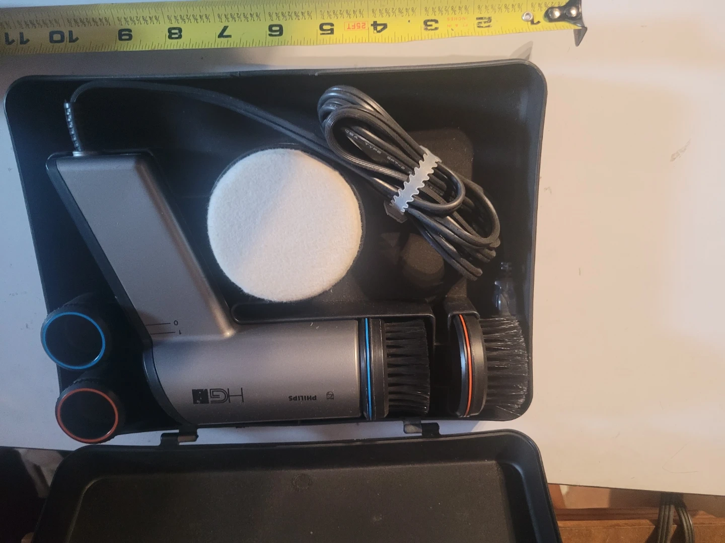 This is a Philips HG shoe polisher kit. It comes with a polisher, cord, and several interchangeable brushes. It's great for keeping your shoes looking sharp!