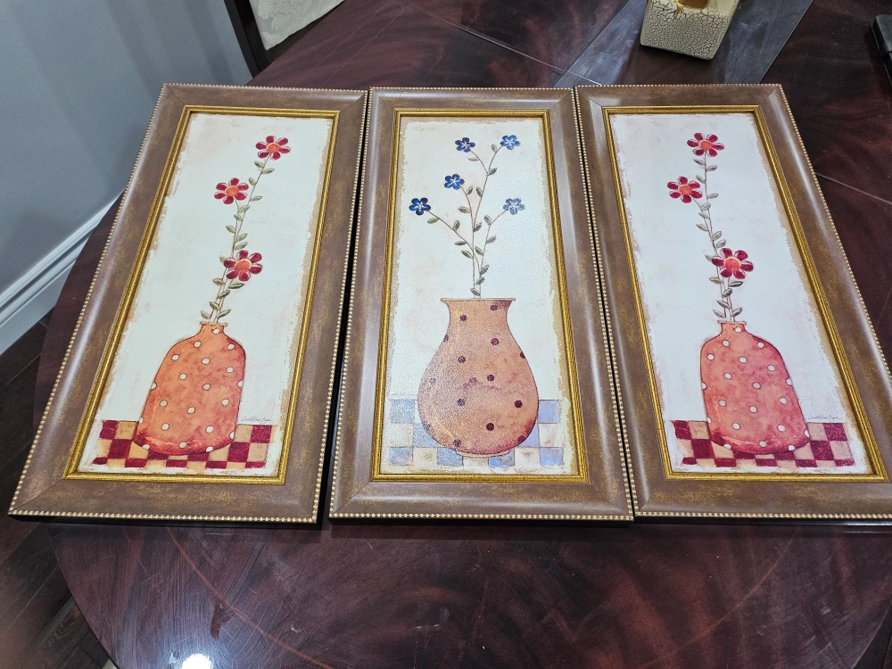 These are like new absolutely beautiful set of 3 paintings. DIMENSIONS: H 23.5" x W 11" Price is $30 form we paid a lot more and there pretty much new. Pick up near mccowan and finch Scarborough.