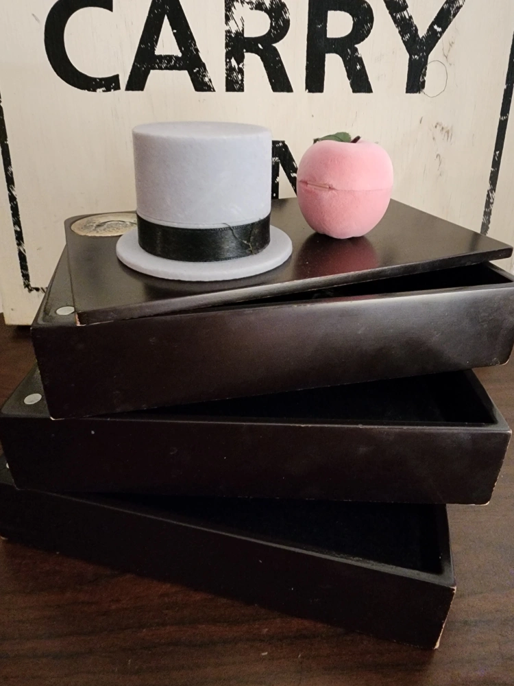 3-drawer jewelry box that definitely has wear and tear but is still functional. plus 2 hinged velvet-like ring or earring boxes.