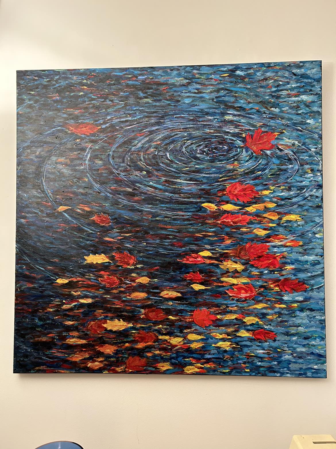 309****note**** more so looking to find this a good home. If you know of someone that could use a large (in my opinion) beautiful painting, please reach out and share why you’d like this. Large painting depicting autumn leaves in a stream. Bright and colourful. Acrylic. Not signed. Can tell you story about it if you want.