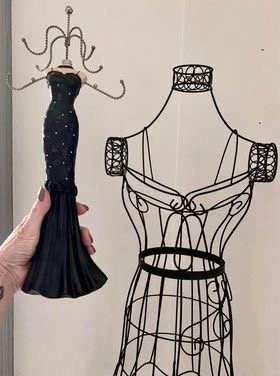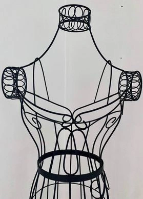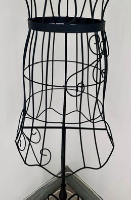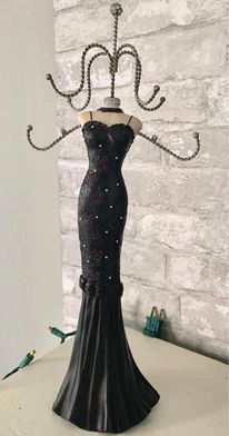 Large mannequin is life-size made of black metal with a scroll design pattern. Small table jewelry mannequin is made resin molded material with dress in black & flesh colored skin. Has decorative metal hooks for rings, bracelets & necklaces. Large mannequin is nice in a hallway, living room or bedroom. Small mannequin is nice on a dresser or displayed together with the large mannequin in a bedroom. Must be picked up.