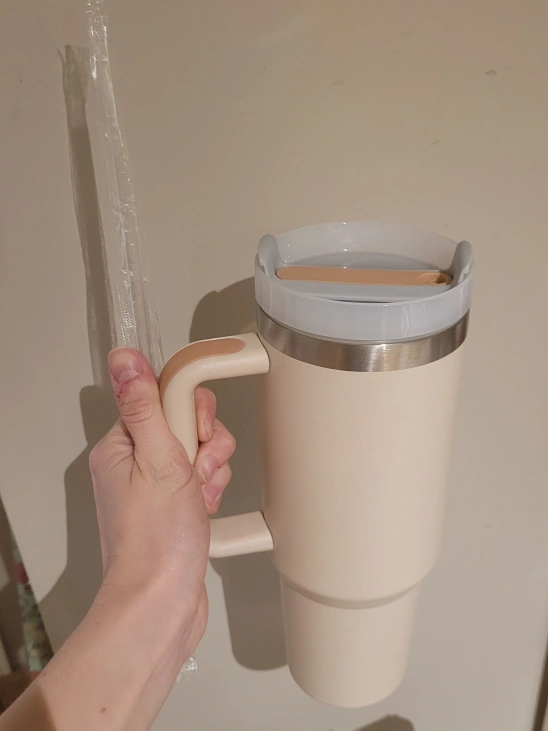 brand new never used metal drink cup. it's huge. it looks like a trendy Stanley cup but idk the brand. light pink. reusable straw included.