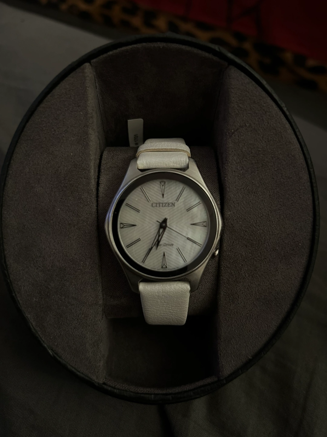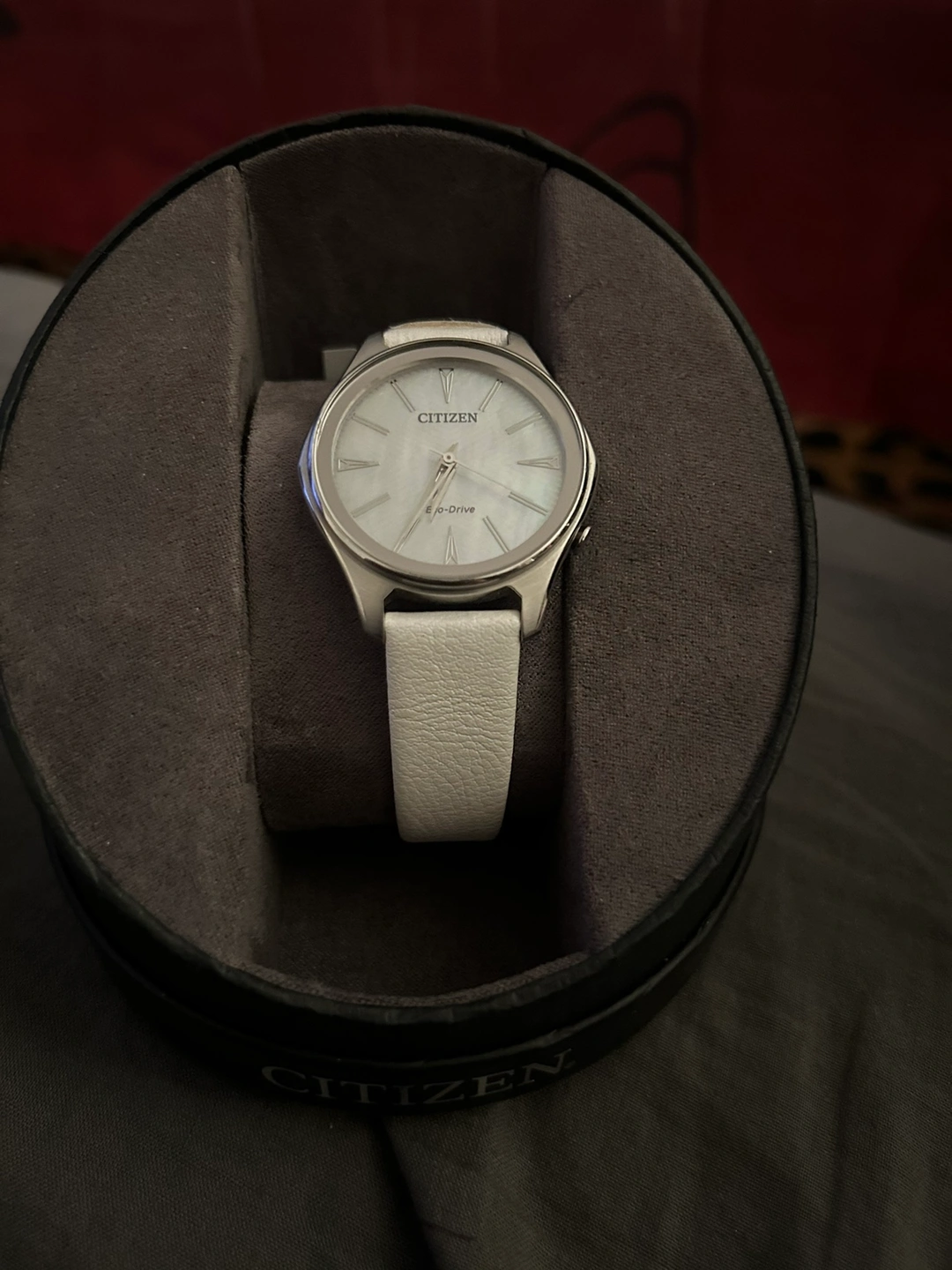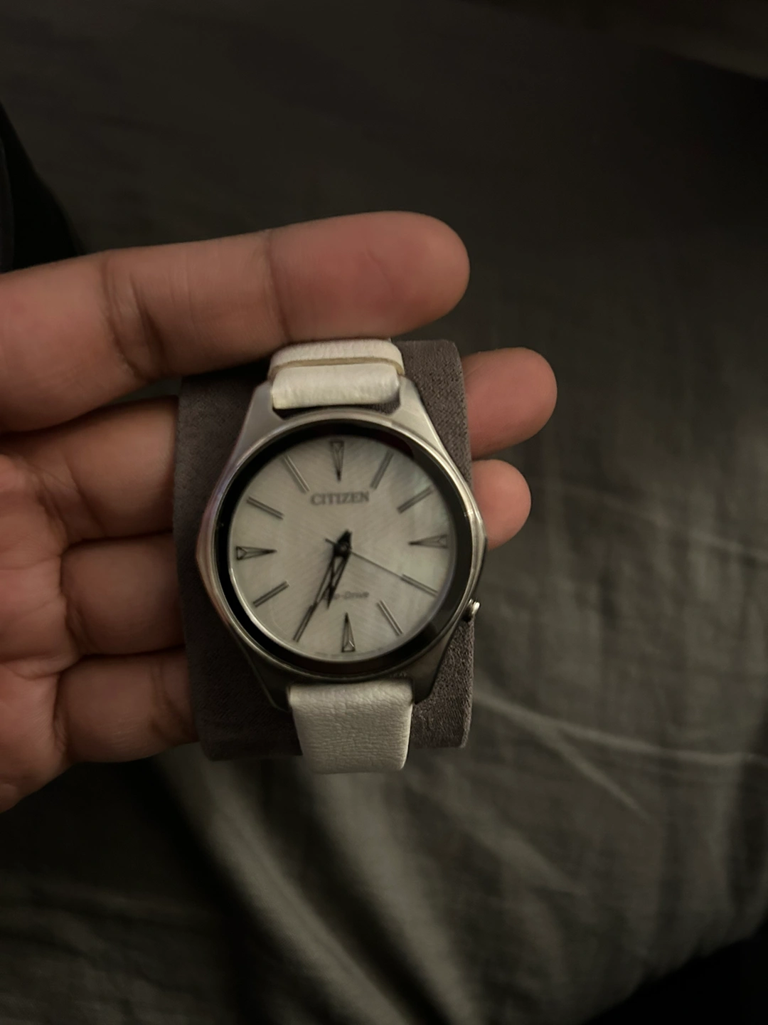 Brand new watch never worn. Silver with white leather strap. Been sitting for a while so the battery needs to be changed or kept out in sun. It is an Eco watch.