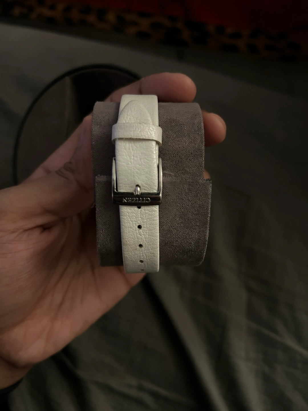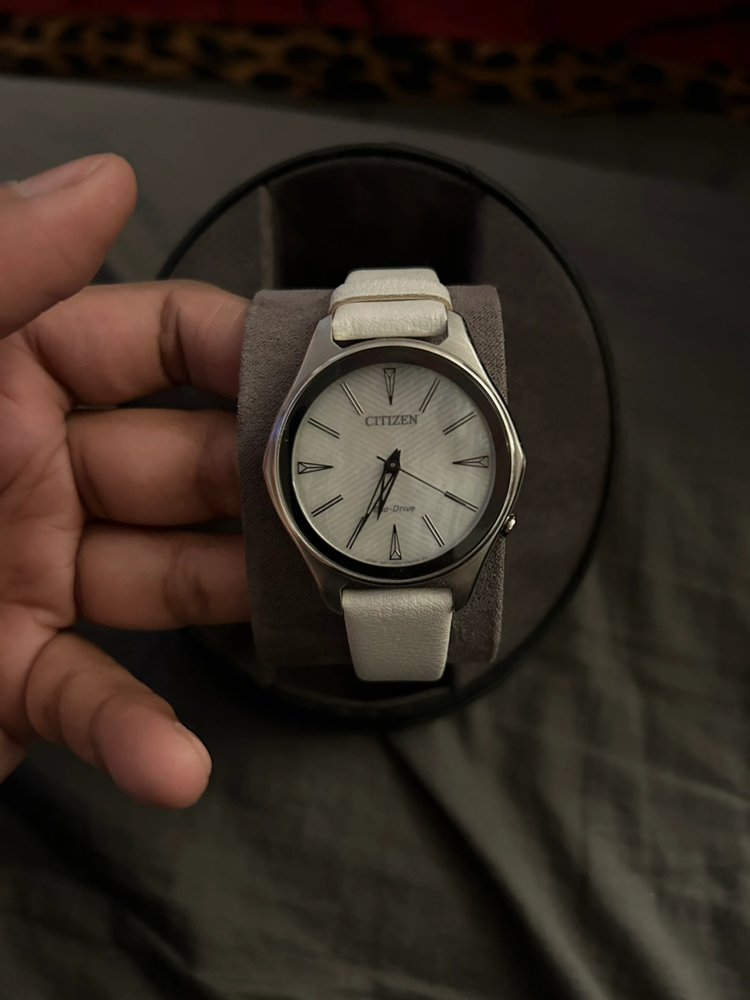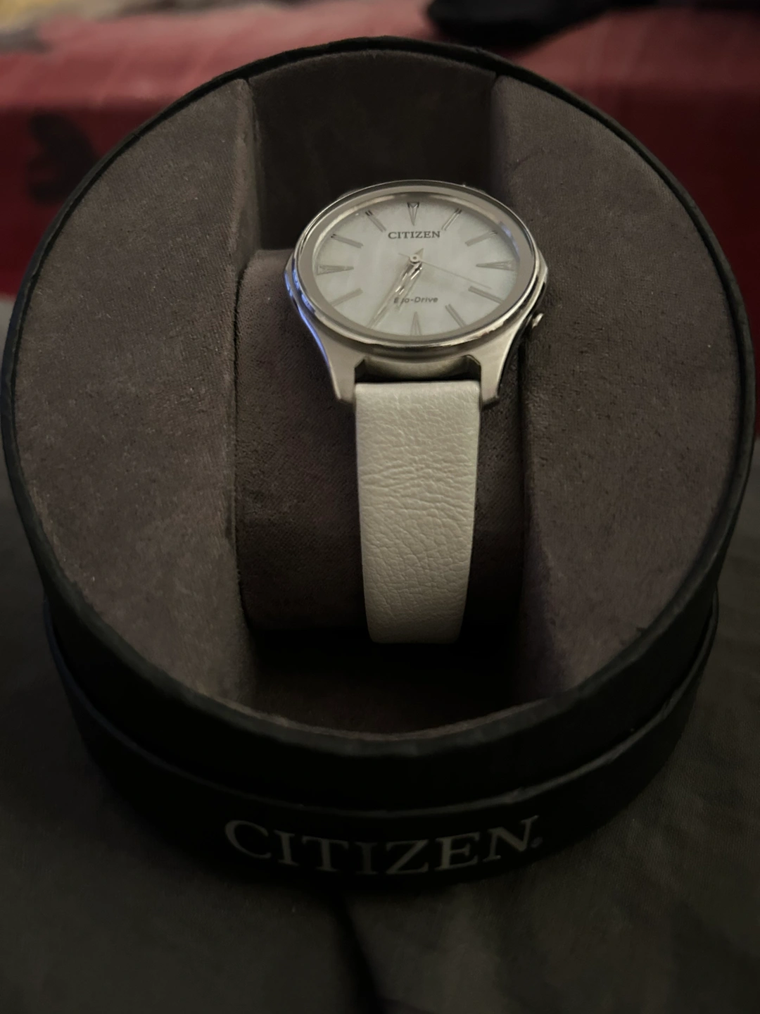 Brand new watch never worn. Silver with white leather strap. Been sitting for a while so the battery needs to be changed or kept out in sun. It is an Eco watch.