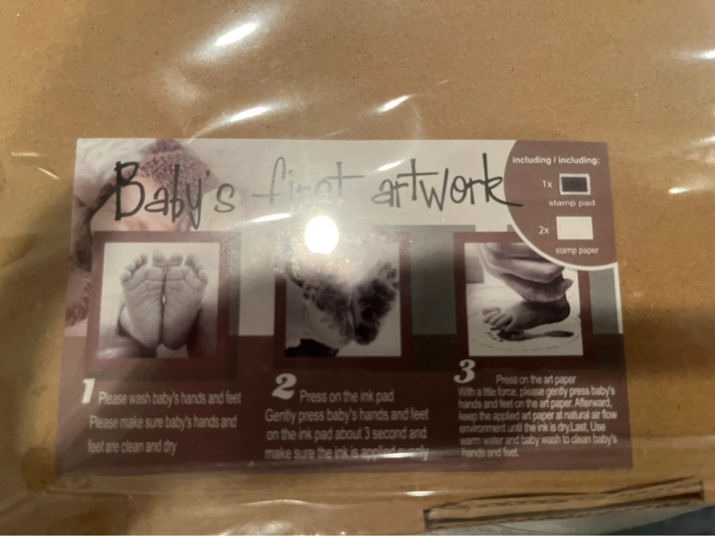 Capture those precious early moments with this Baby's First Artwork keepsake frame kit! It's perfect for displaying your little one's handprints and footprints alongside their monthly photos. The kit includes everything you need to create a lasting memory of their first year. A stamp pad and stamp paper are included to make the hand and foot prints