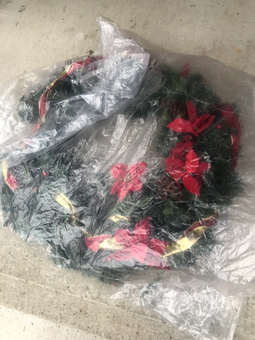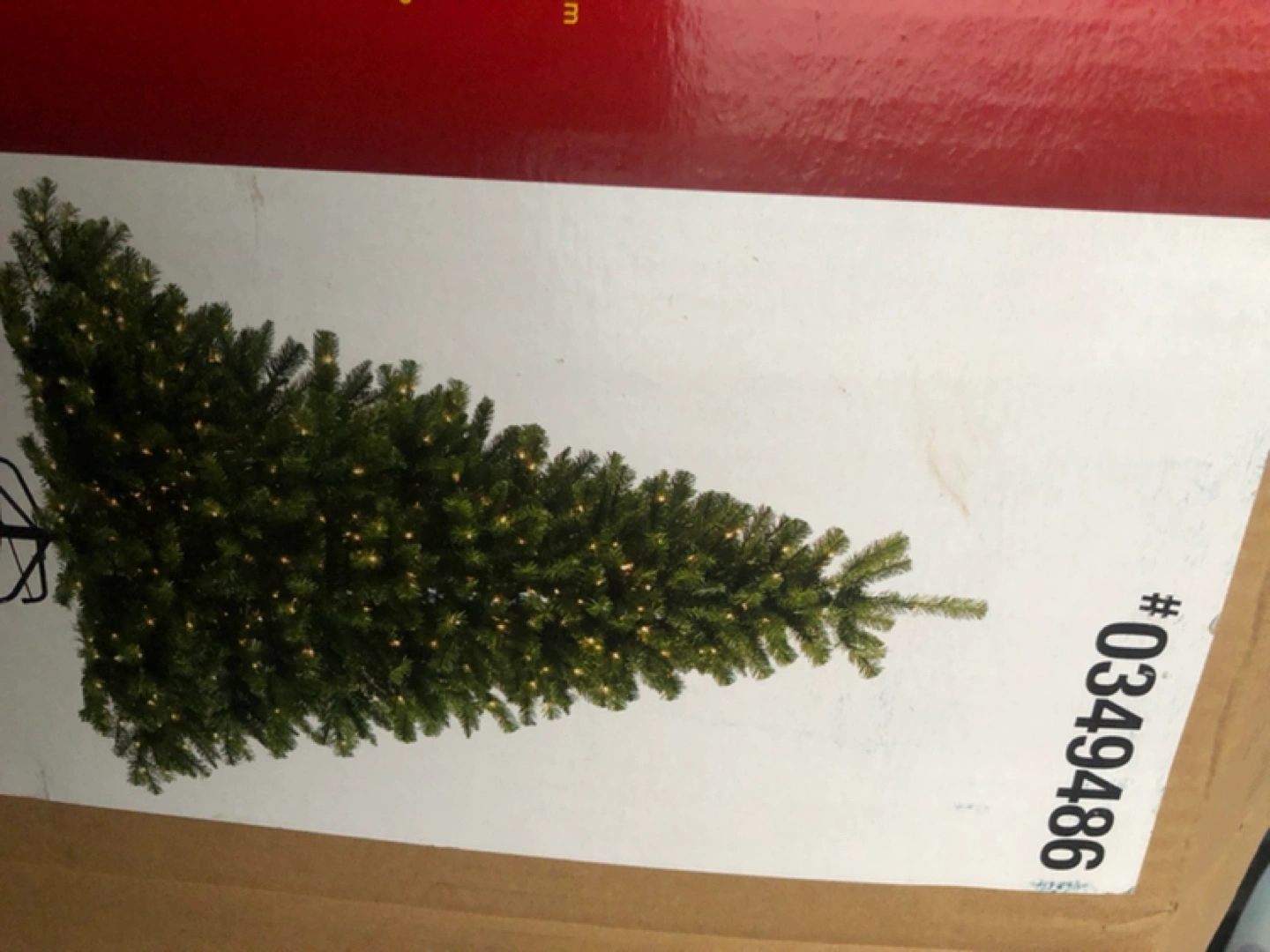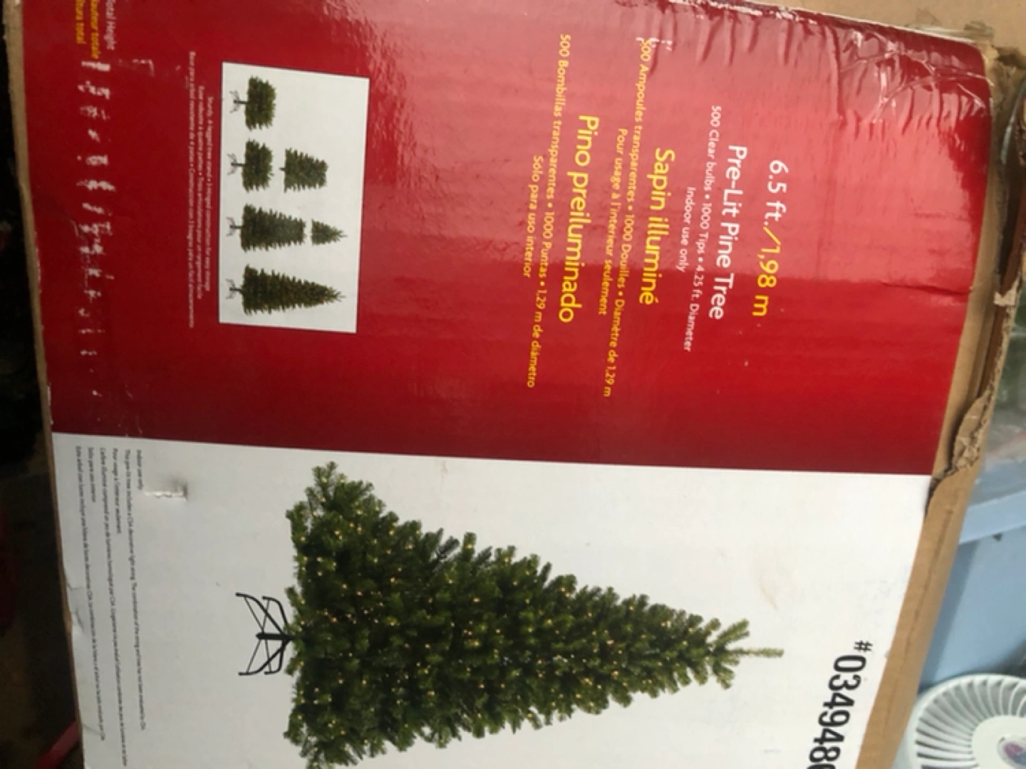 807Christmas tree $60.00 with lights. 6.5 feet prelim. Wreath $10 needs some extra decorations