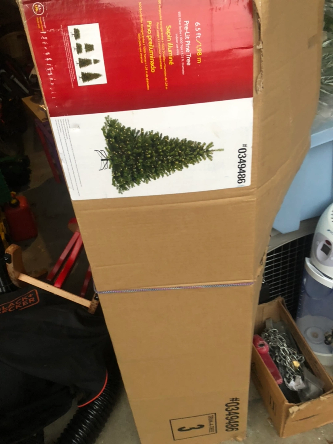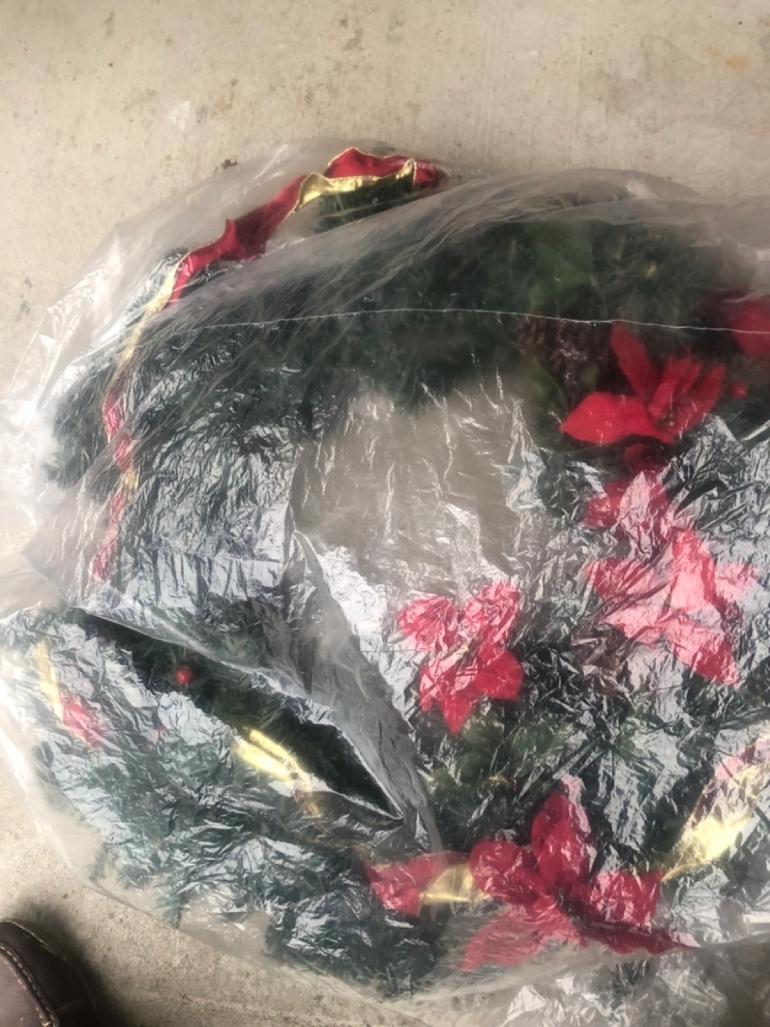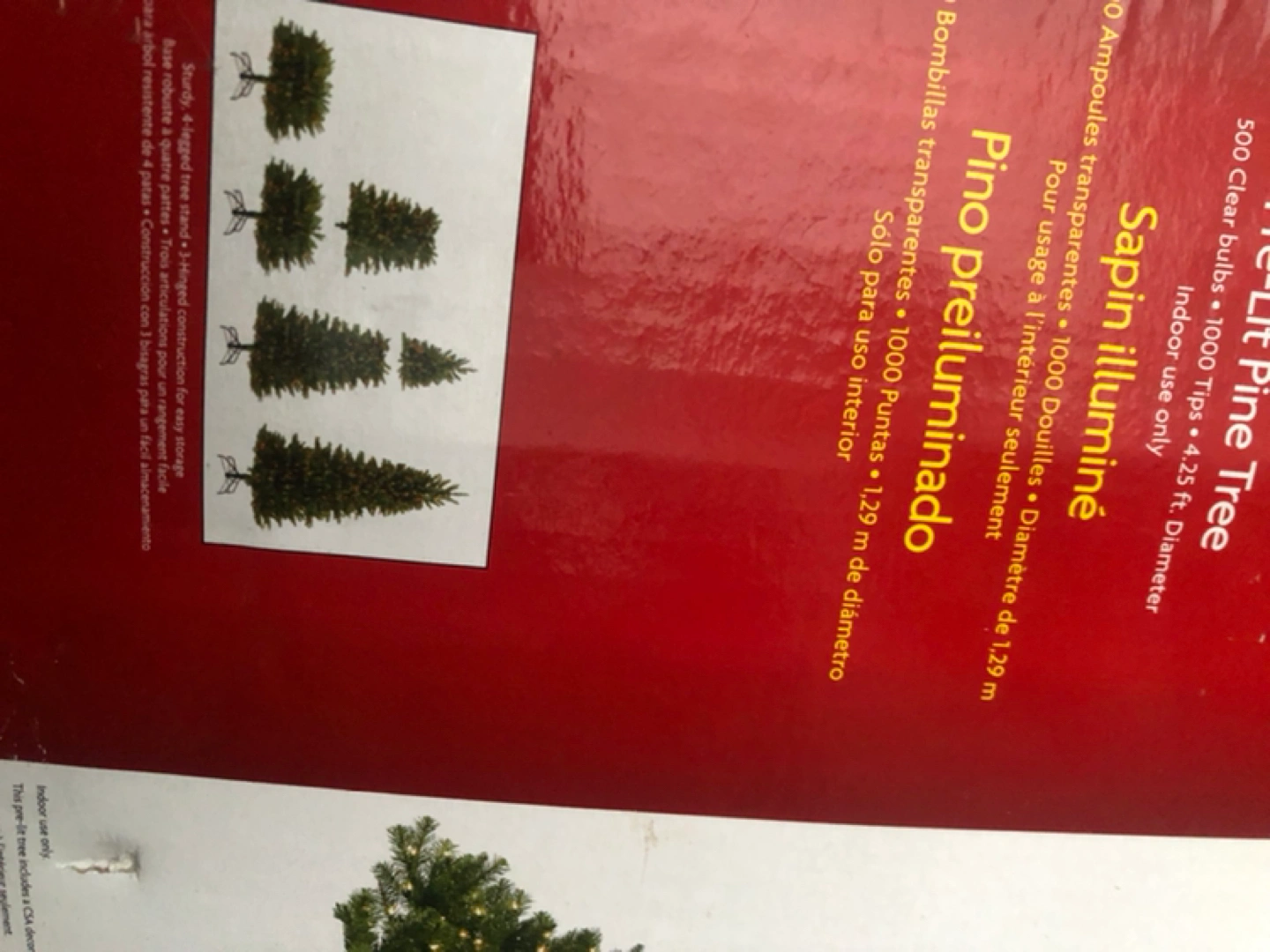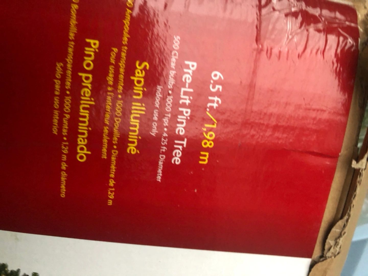 807Christmas tree $60.00 with lights. 6.5 feet prelim. Wreath $10 needs some extra decorations