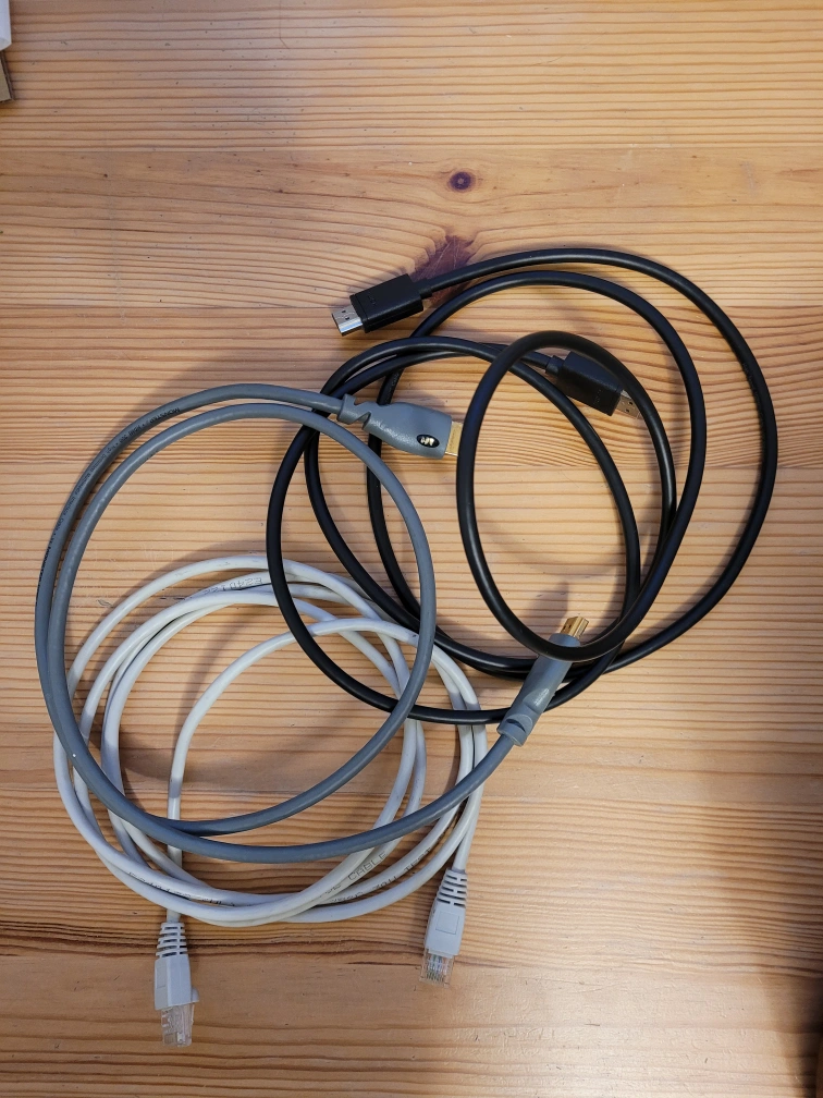 Two HDMI cables (grey and black) and one ethernet cable (white). All work just fine still! I needed longer ones though