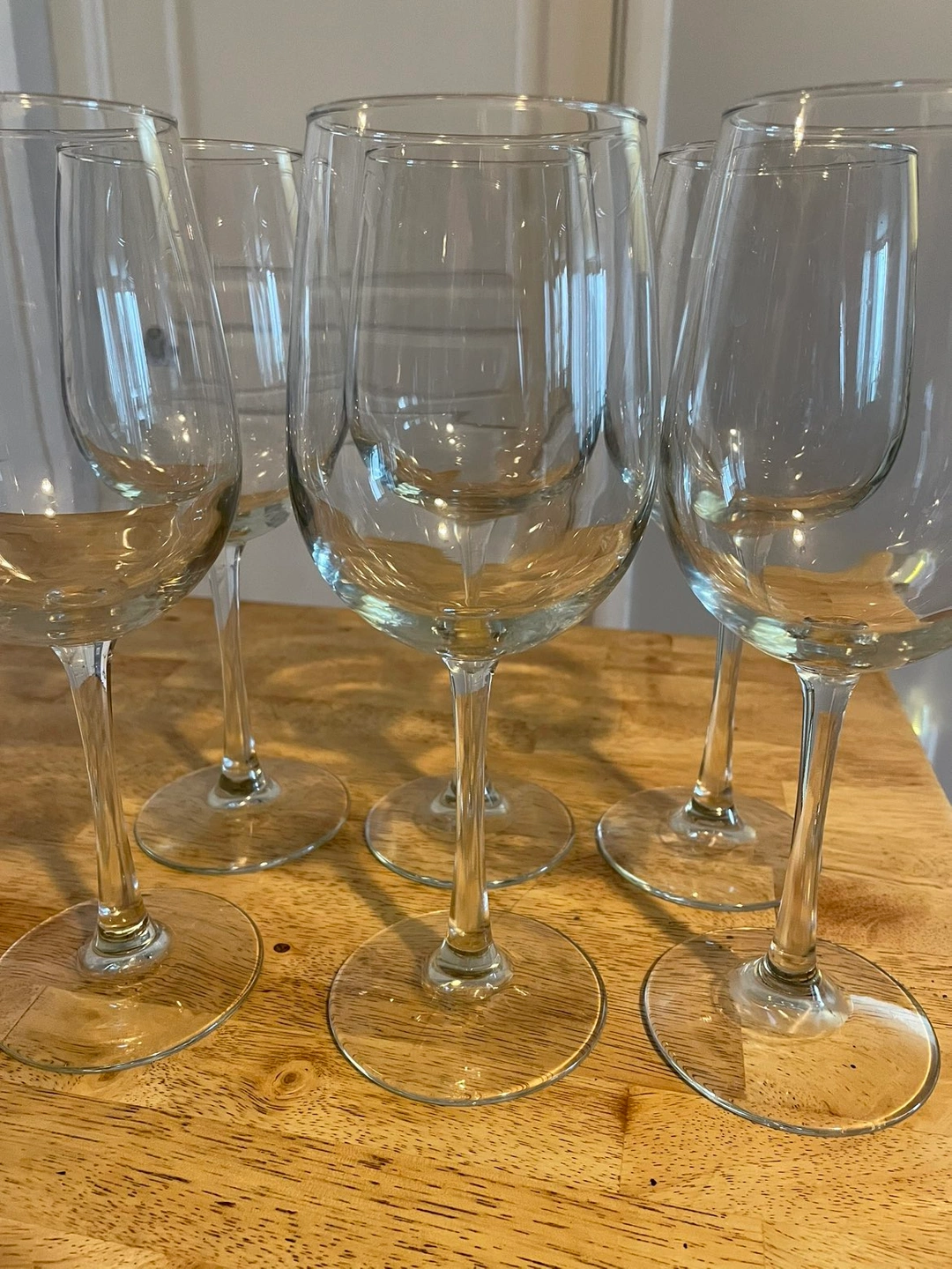 Purchased them unused, originally had set of eight but used a few only so selling six. I have original box. If you’re interested in still having complete set of eight I can add them in for total of $25. Good quality King stem u shape could be great for both white and red wines.