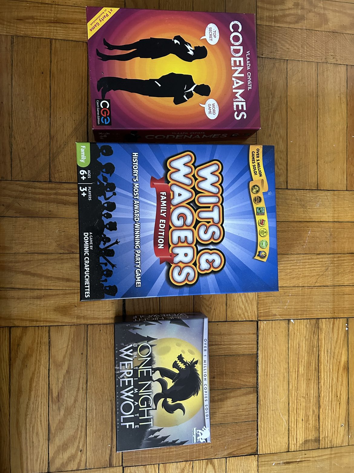 438Assorted Board Games!! 1. one night ultimate werewolf 2. wits and wagers (family edition) 3. codenames 15 each Take all for 40cad Each retails for 24.97, 24.99 and 25.99 plus taxes (84.74 if will buy in store) From pet, smoke and bug free home I can do meetup at any line 2 subway stations or downtown during mondays or fairview mall/don mills during weekends Etransfer or cash is fine. Ty
