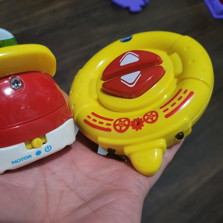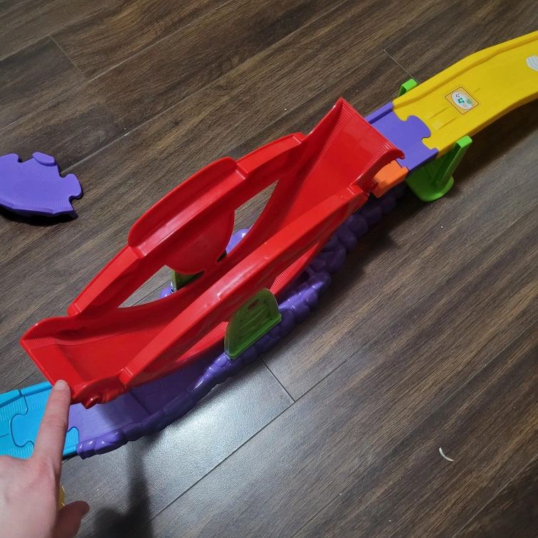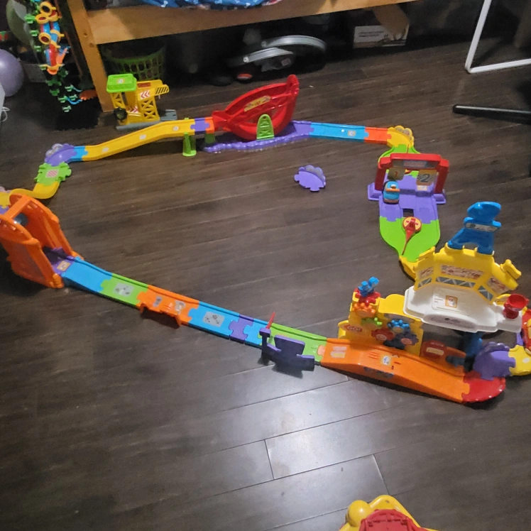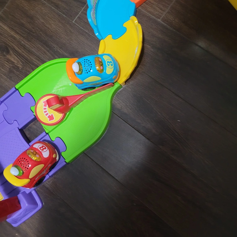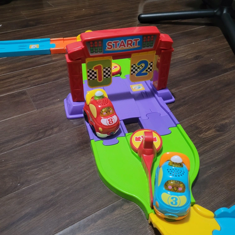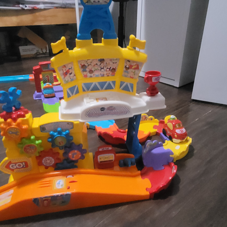 Large vtech track that you assemble the way you like. There are pit stops, slips on the track, and elevator and slides! Cars talk as they hit different points in the track! Remotes are made for little fingers just has forward and backwards!! I have 2 cars, but only 1 remote works. You can purchase more cars with remote separately but if you put the cars on the same settling the one remote can control both cars just space them out on the track. Video is available to show u if u want! Amazing toy, so much fun! Meet up walmart at 5995 steeles ave markham, or coxwell and mortimer area some days. Serious inquiries only please
