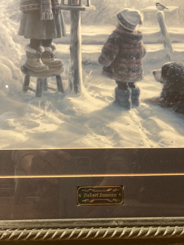 Beautiful wood and glass, double matted art print “For the Chickadees “ by Robert Duncan, see name plate.
