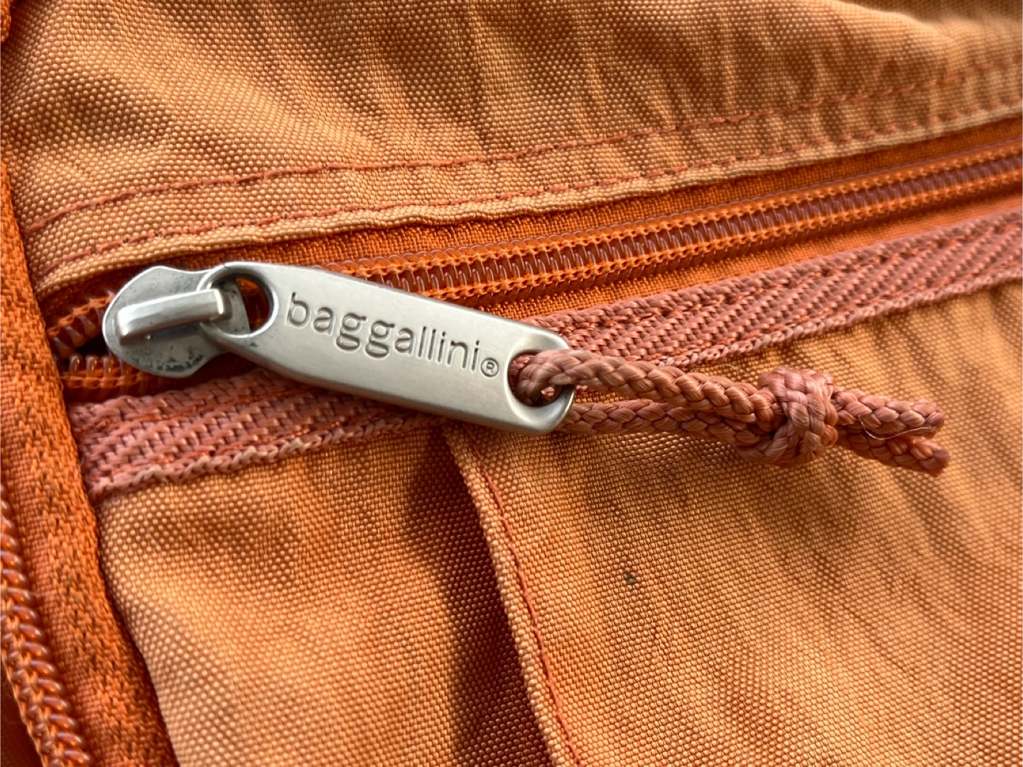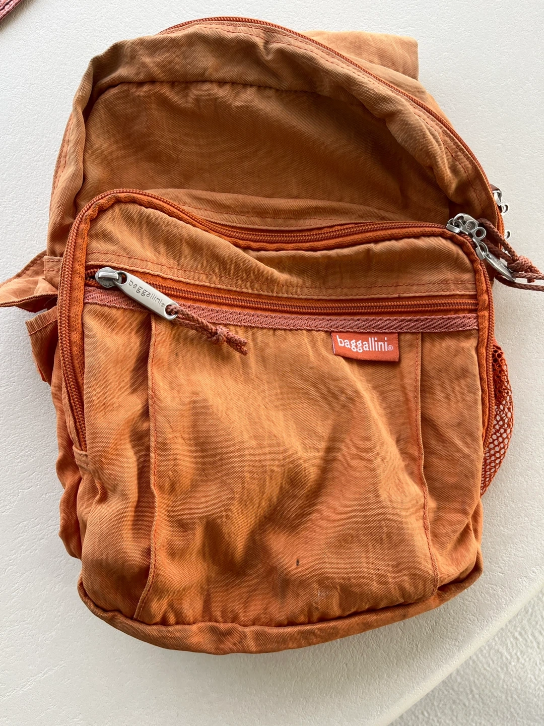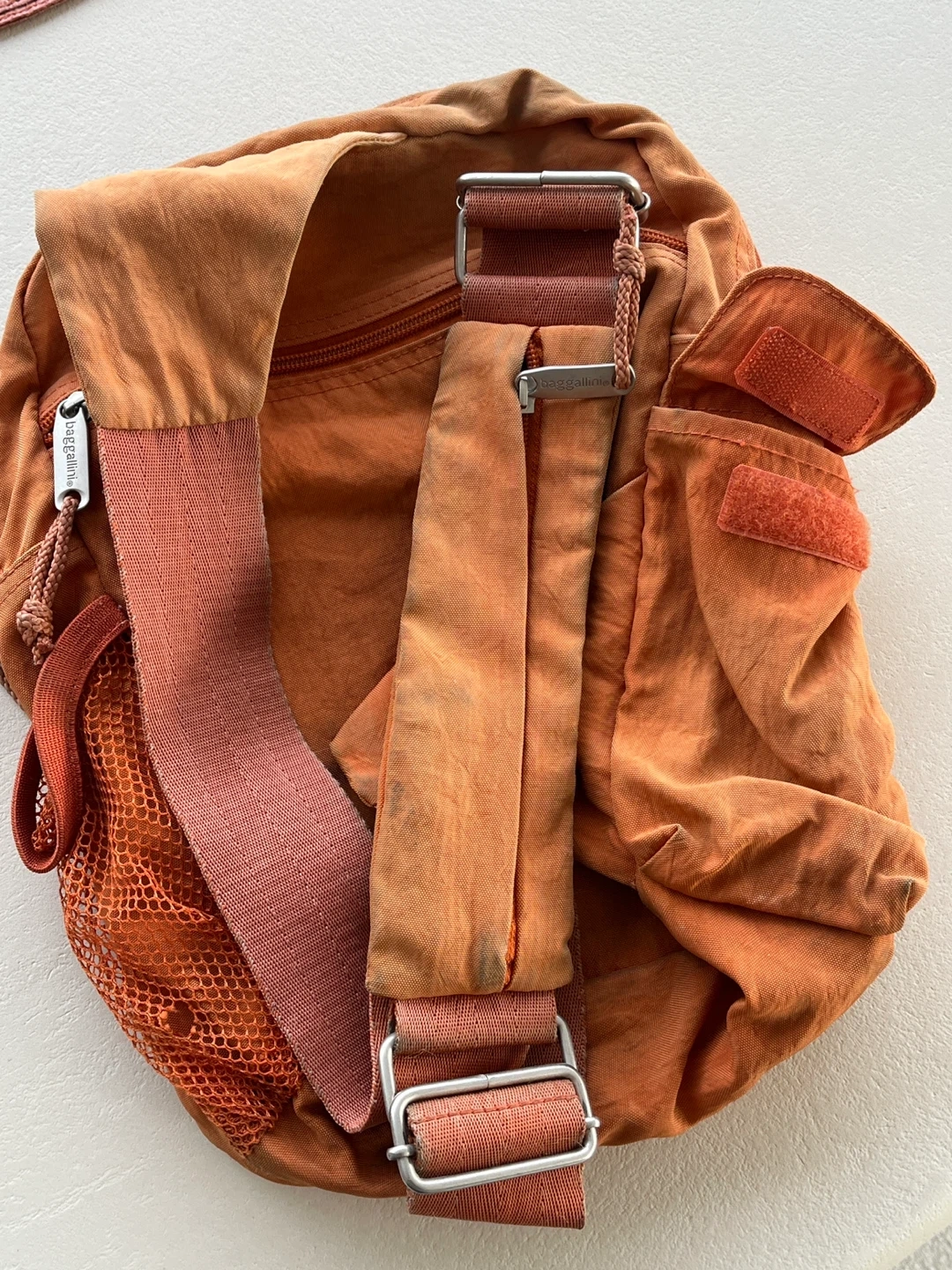 This used orange Baggallini sling backpack is made of nylon. It features multiple zippered pockets for organization and an adjustable strap. It has a mesh side pocket. There is some fading colour due to age.