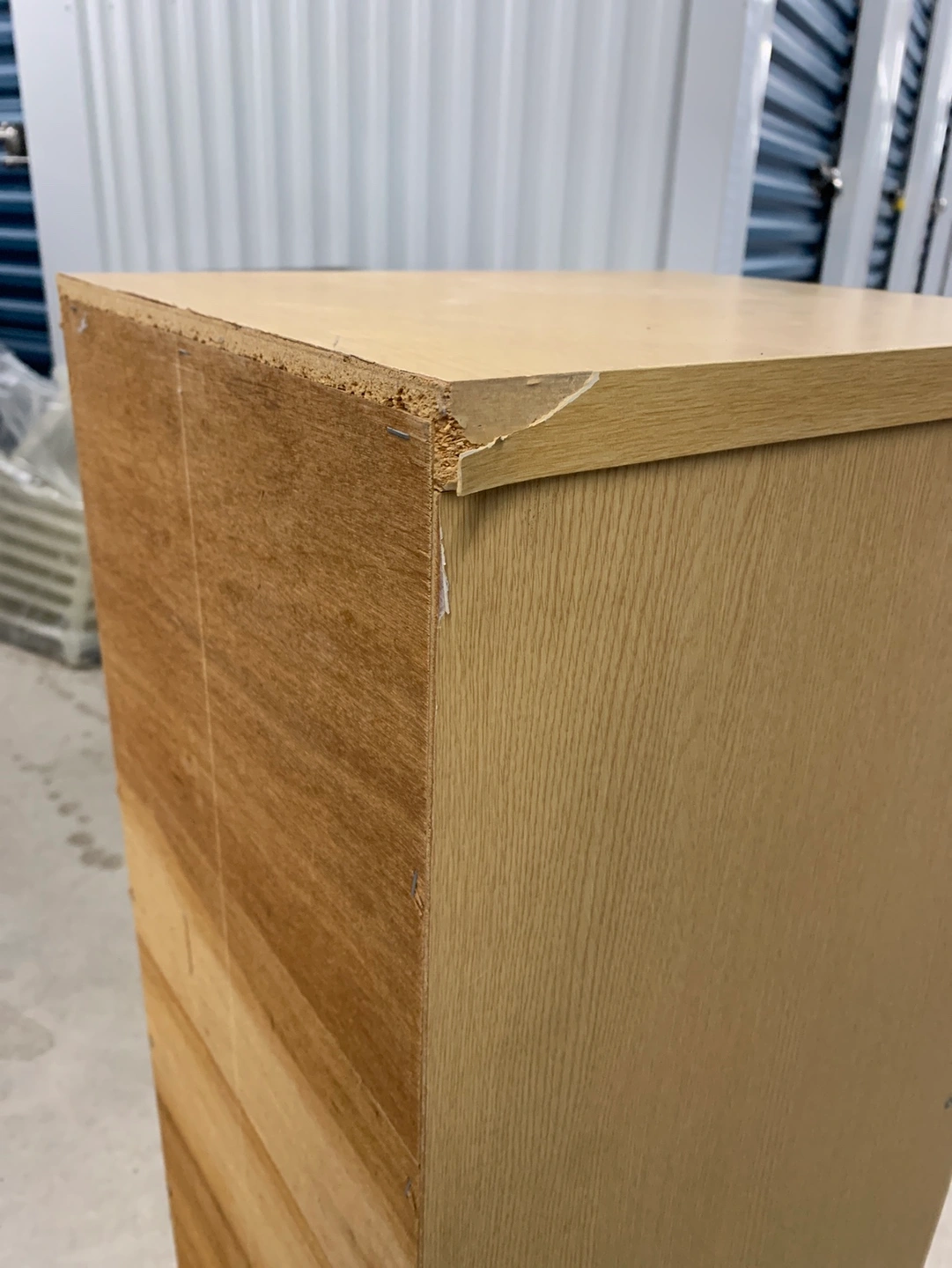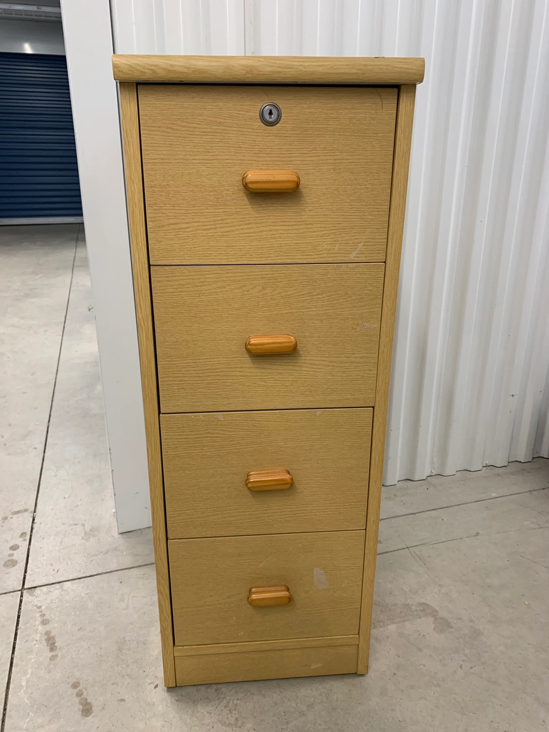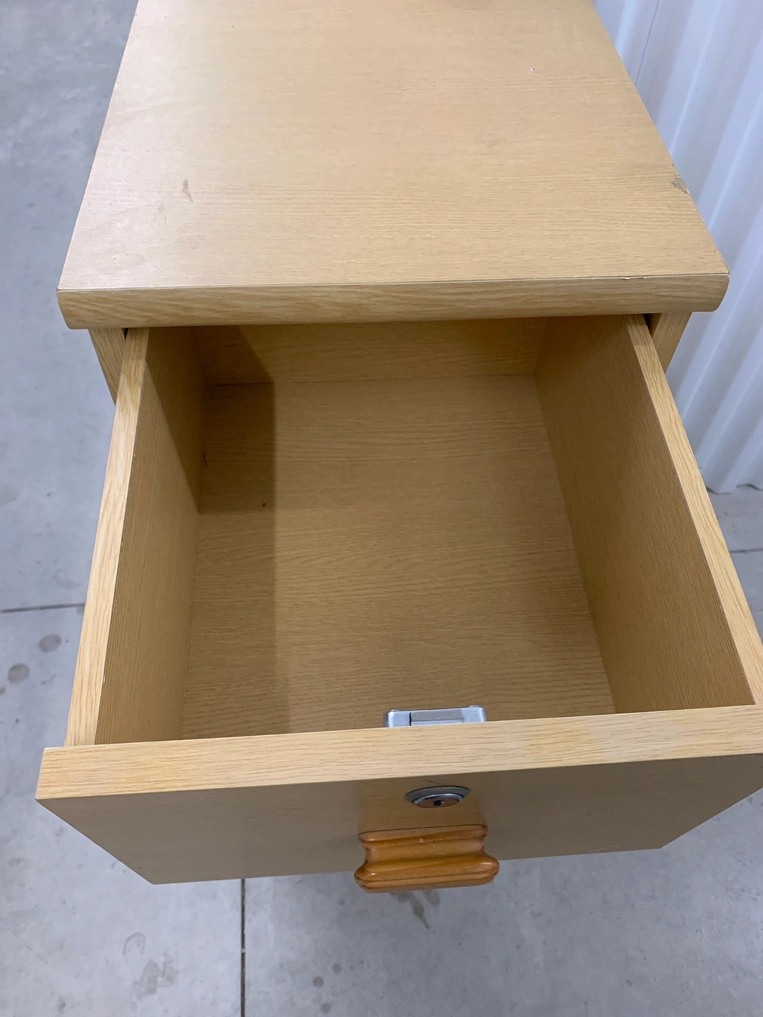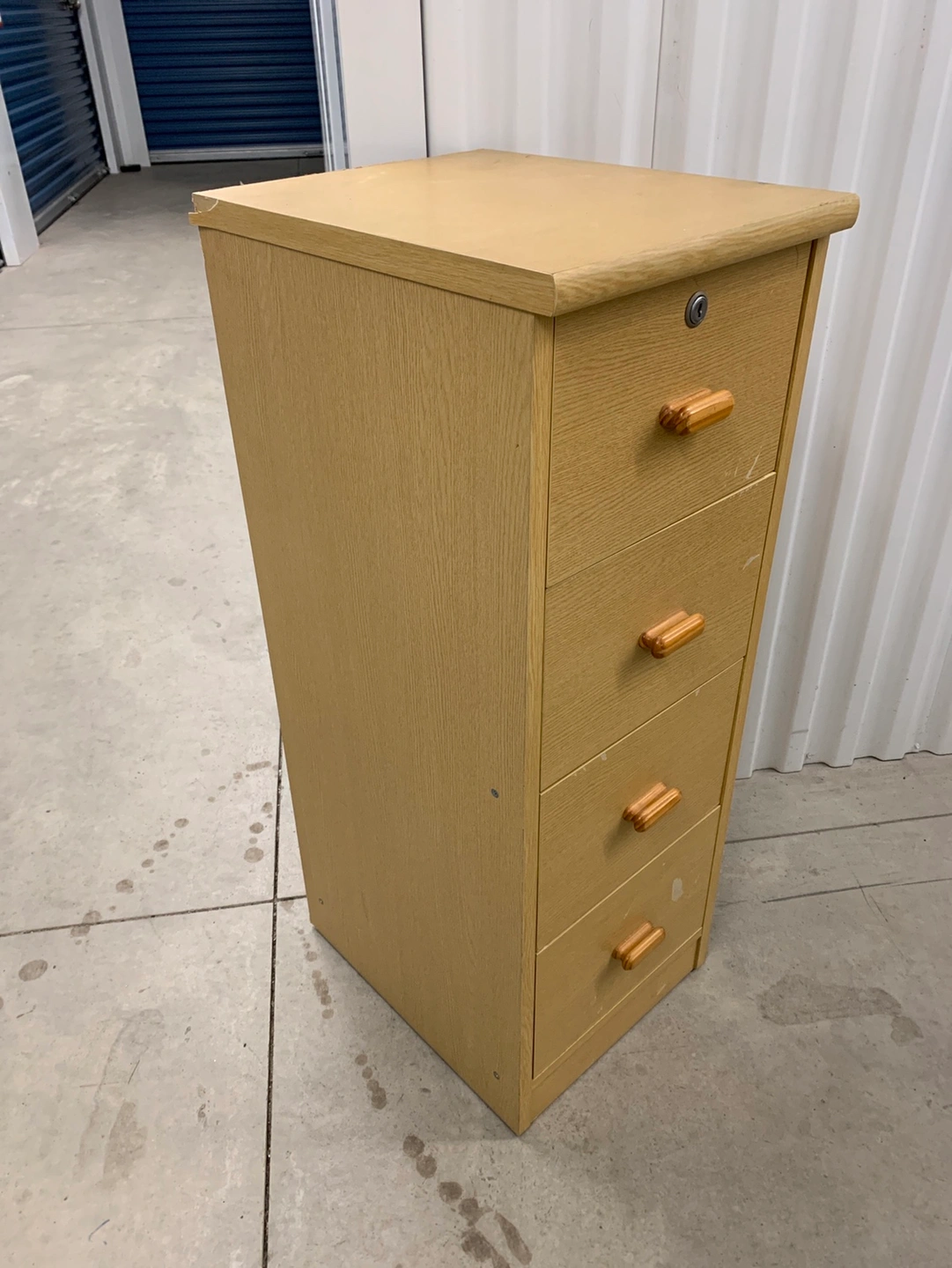 A very timeless wooden shelf. It’s slightly aged but still very sturdy. The first drawer used to have a lock but there’s no key anymore. Can still be used as a regular drawer.