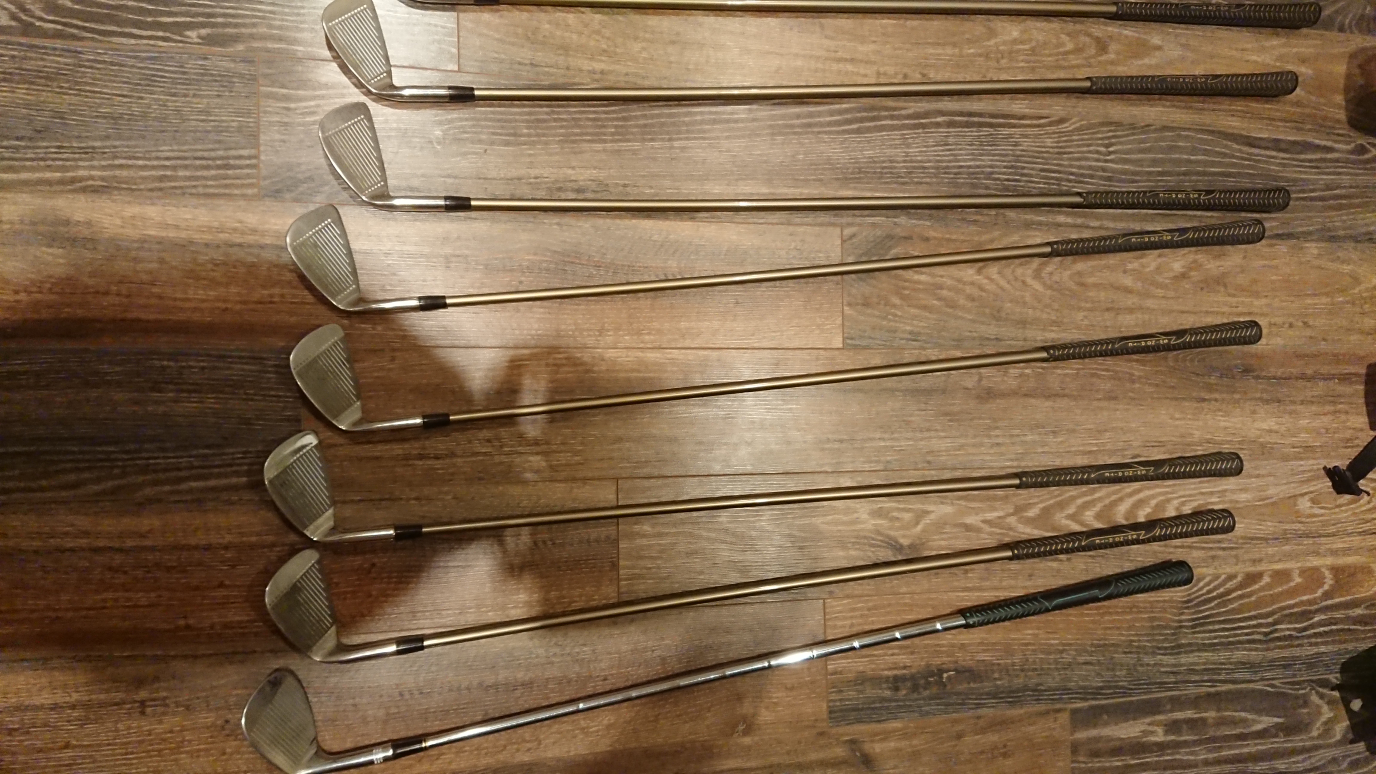 13 clubs: Driver, Wood 3 & 5, Irons 3 through 9 & P, Wedge and Putter. Includes bag with rain cover and folding handcart. All used but in good condition. Asking $50 OBO.